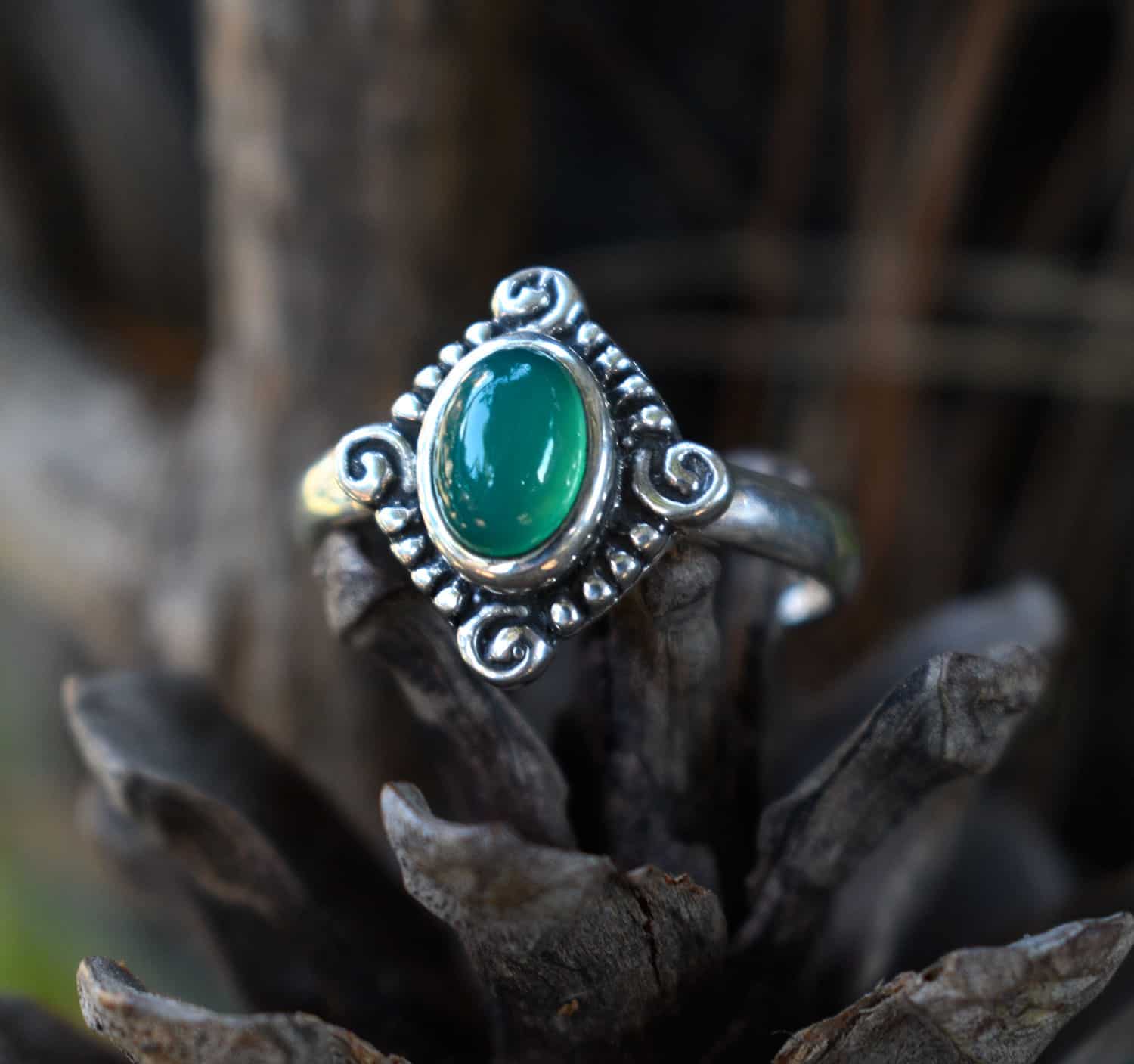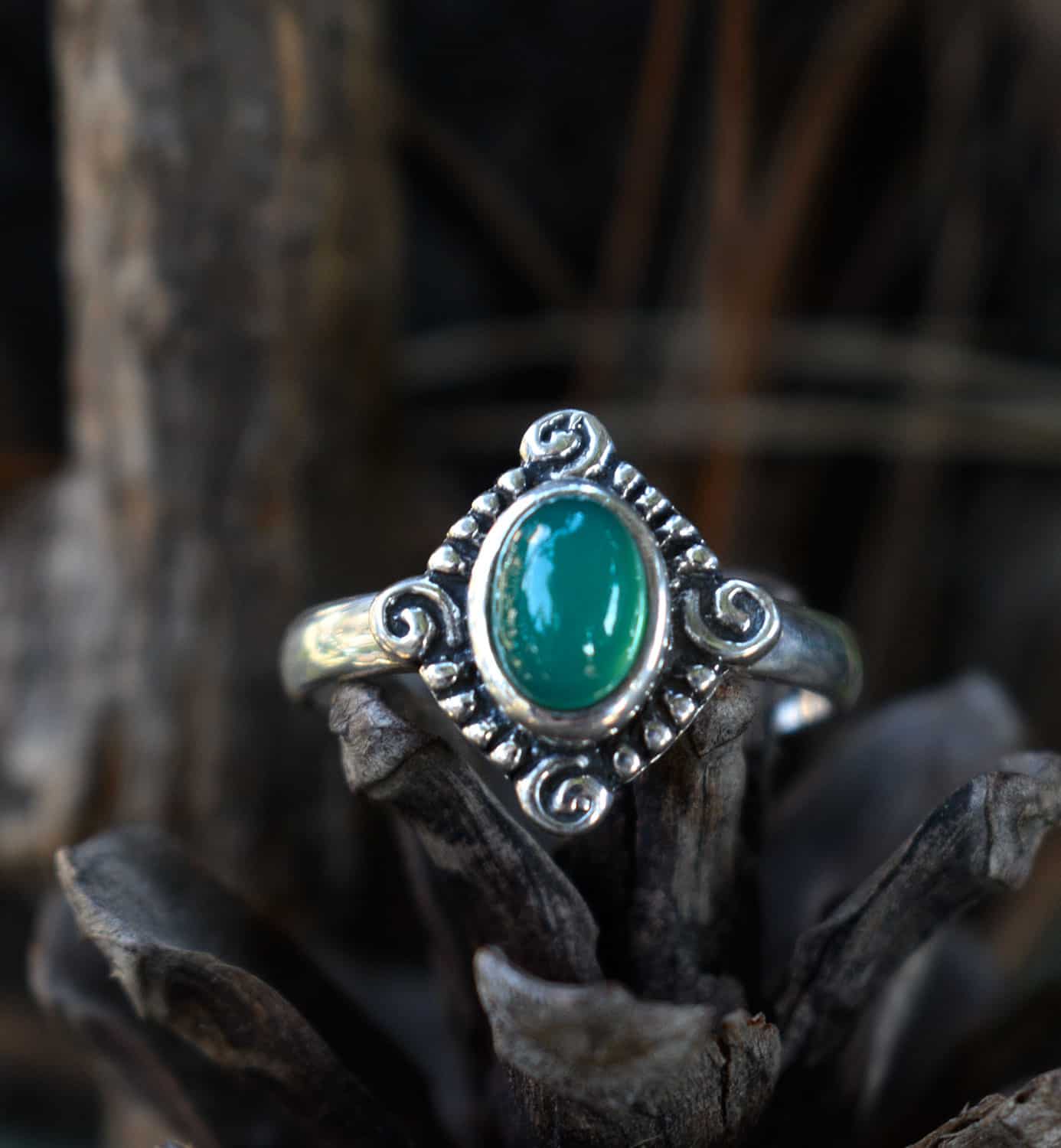 Stunning sterling silver 925 ring decorated with genuine green onyx semi precious stone. The astonishing carving makes Actaea ring unique and reveals its beauty.