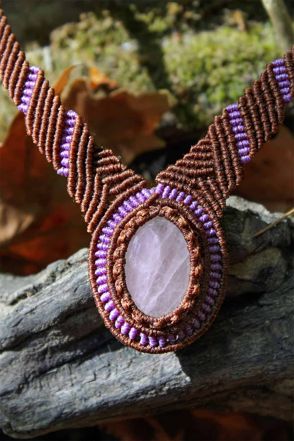 When the simple act of knitting meets fantasy and become an art form. Beautiful alruna necklace using the technique of macramé. Decorated with genuine rose quartz stone. Every piece is unique and 100% handmade.