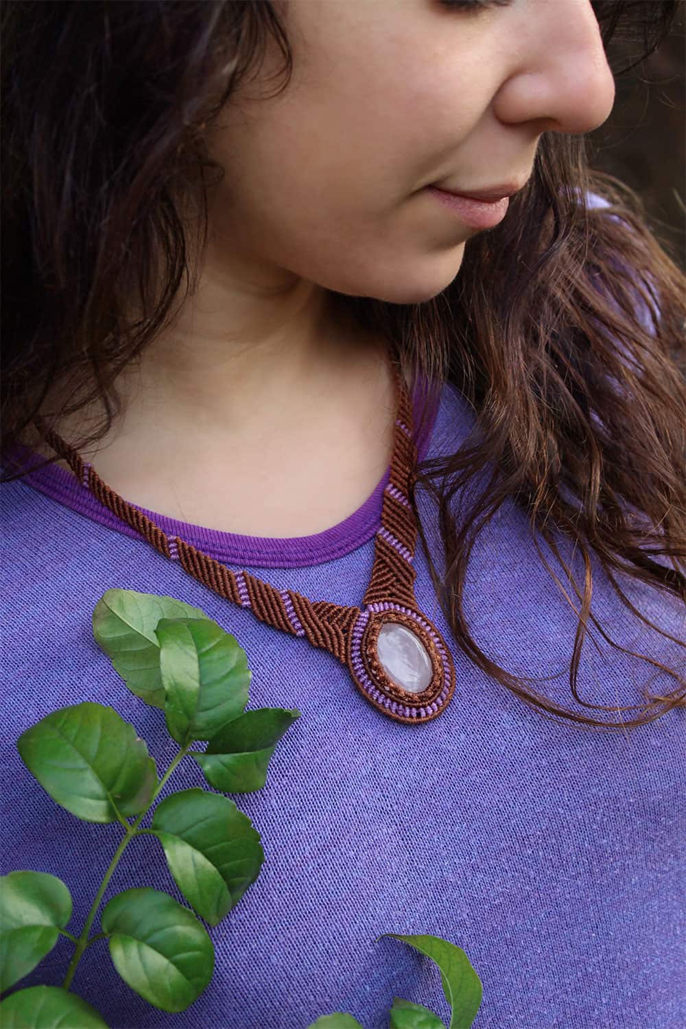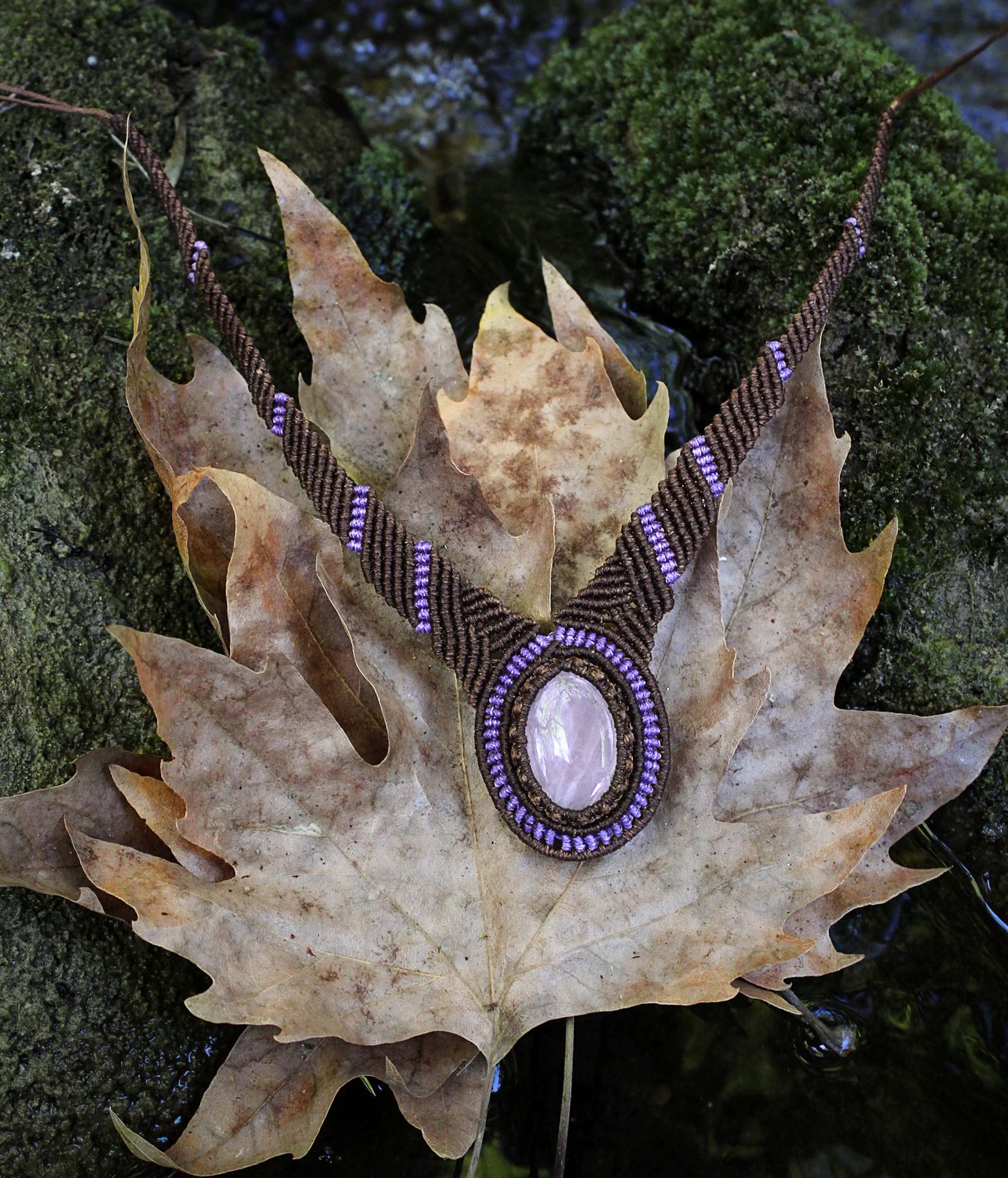 Beautiful alruna handmade necklace. Macrame is a technique that gives you the opportunity to create beautiful shapes and designs by knitting, using threads. These threads are 100% hypoallergenic and extremely durable. The colours are never fade out over the years due to the quality of the thread. For alruna necklace we used brown and lilac colours. Decorated with genuine rose quartz stone. Concidered to be the stone of unconditional love and spiritual healing.