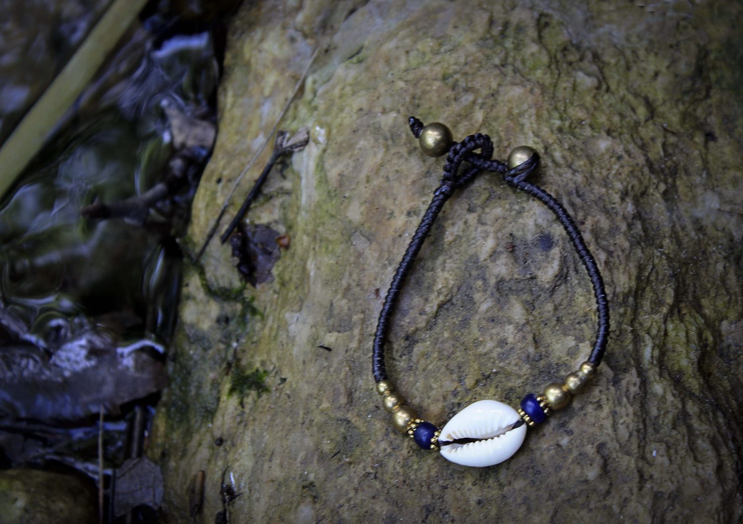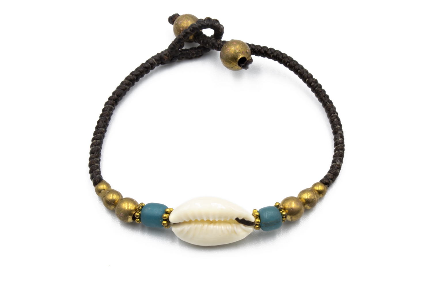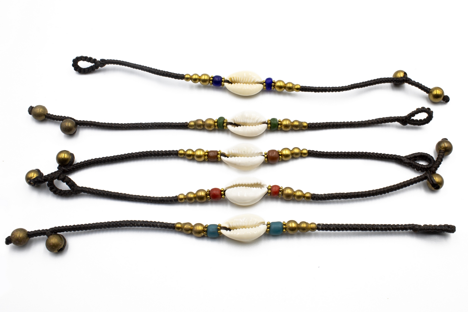 Four different elegant bracelets using best quality waxed thread, one natural sea shell, brass beads and two jingle bells as clasp. Adjustable in one of two jingle bells. You can find them in 4 different options : with aqua, brown, red or blue beads to make the bracelet even more beautiful and unique.