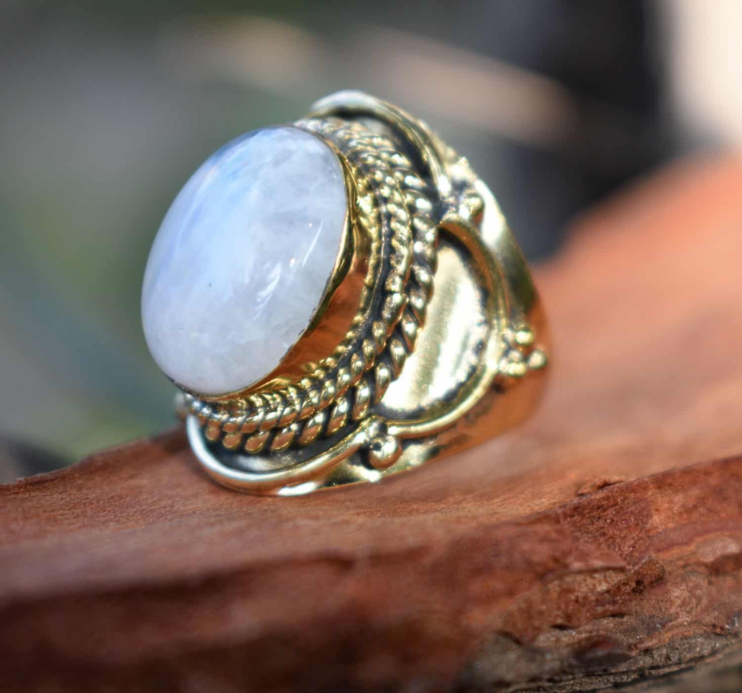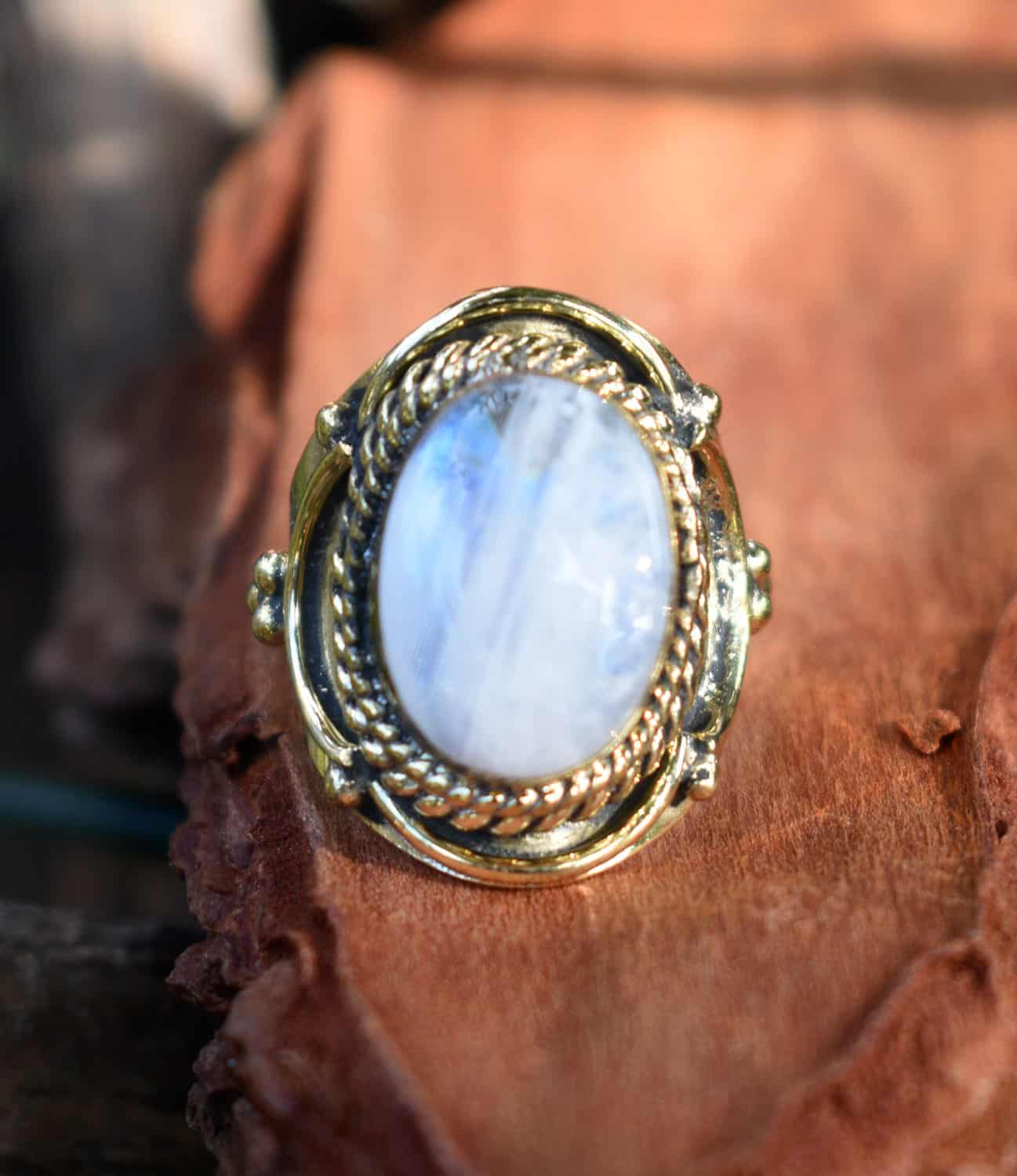 Beautiful Armonia brass ring decorated with genuine moonstone semi precious stone. Very easy to clean and maintain when you need.
