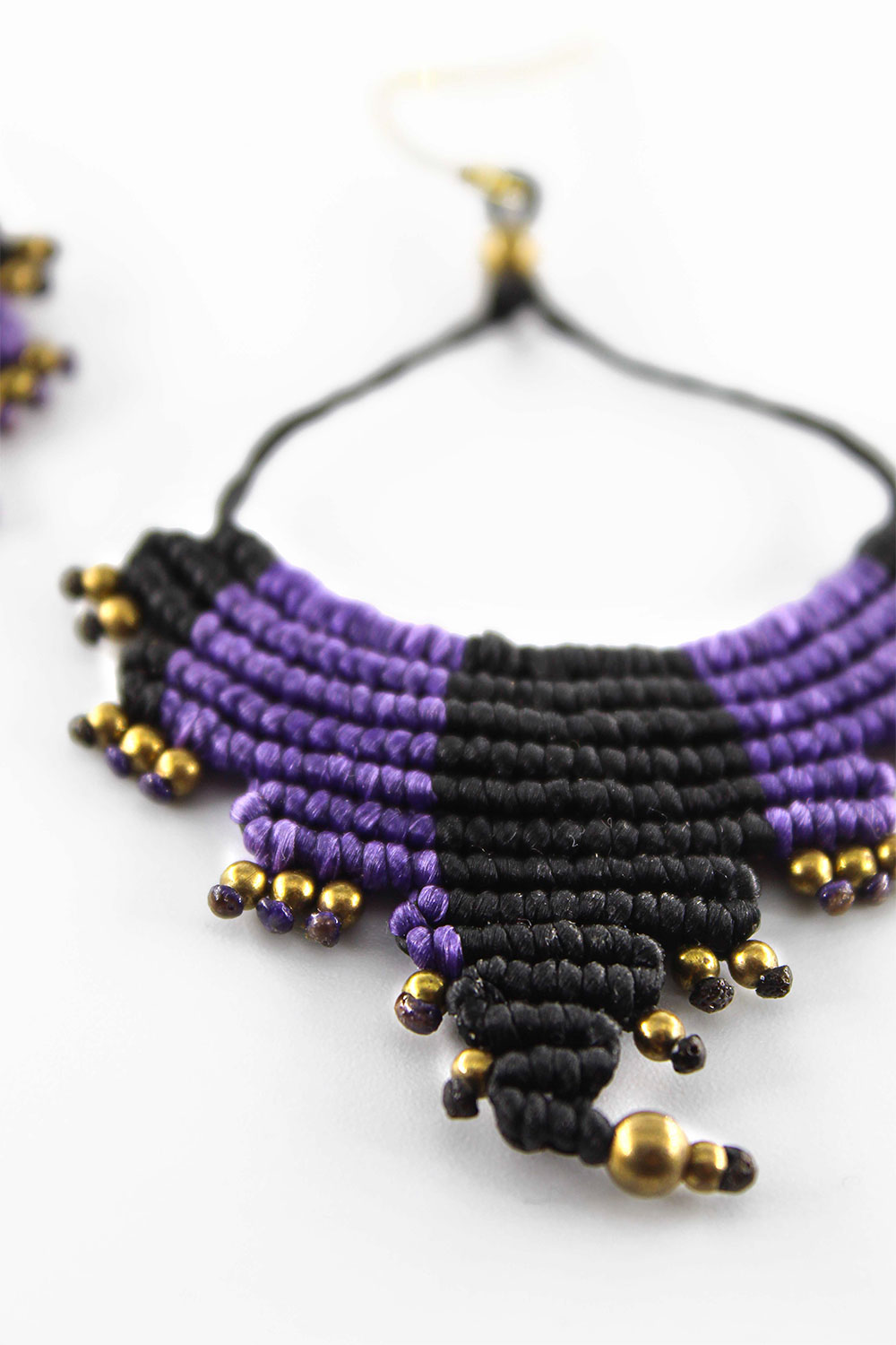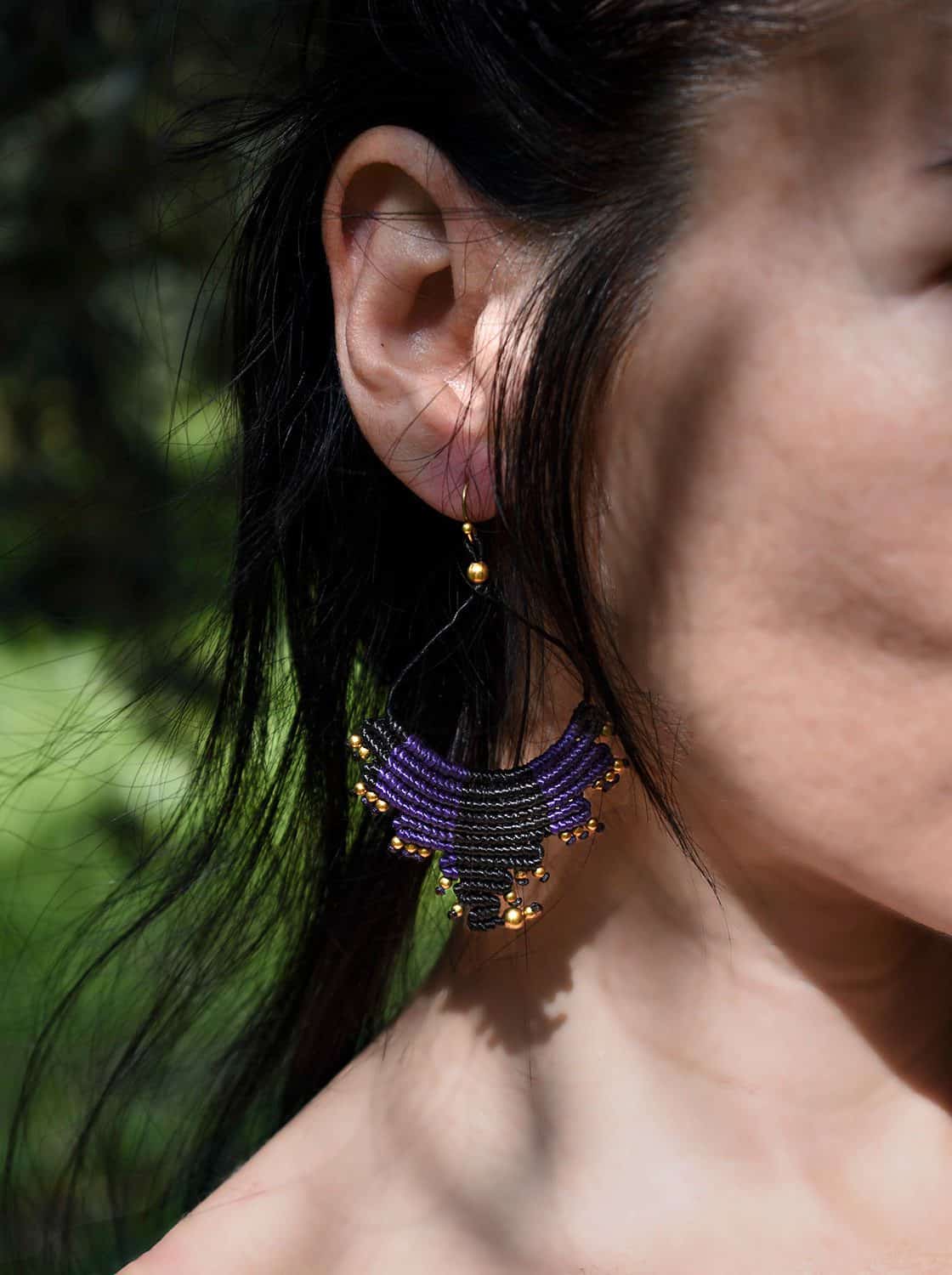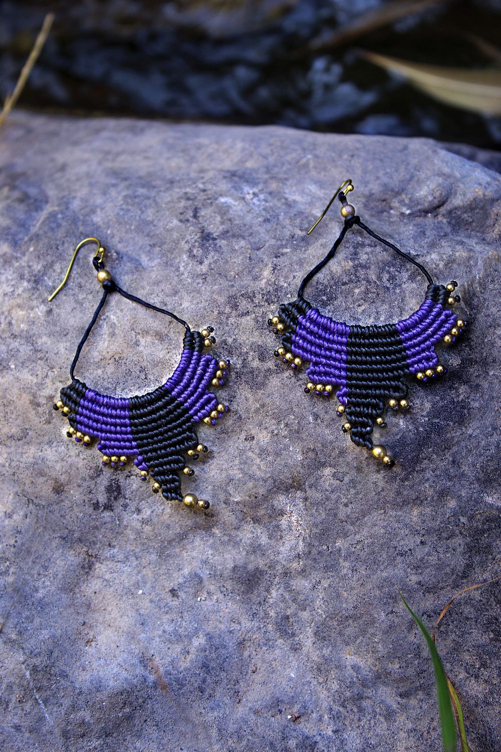 Beautiful echo handmade earrings. Macrame is a technique that gives you the opportunity to create beautiful shapes and designs by knitting, using threads. These threads are 100% hypoallergenic and extremely durable. The colours are never fade out over the years due to the quality of the thread. You can find them in two options : with black and purple wax thread or brown and blue. Decorated with brass beads.