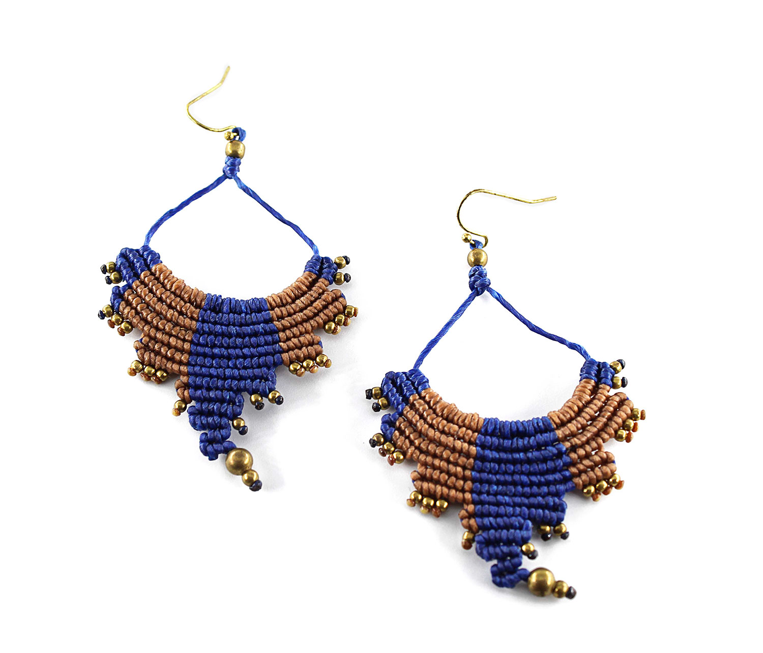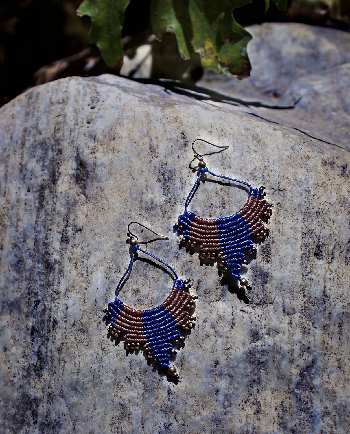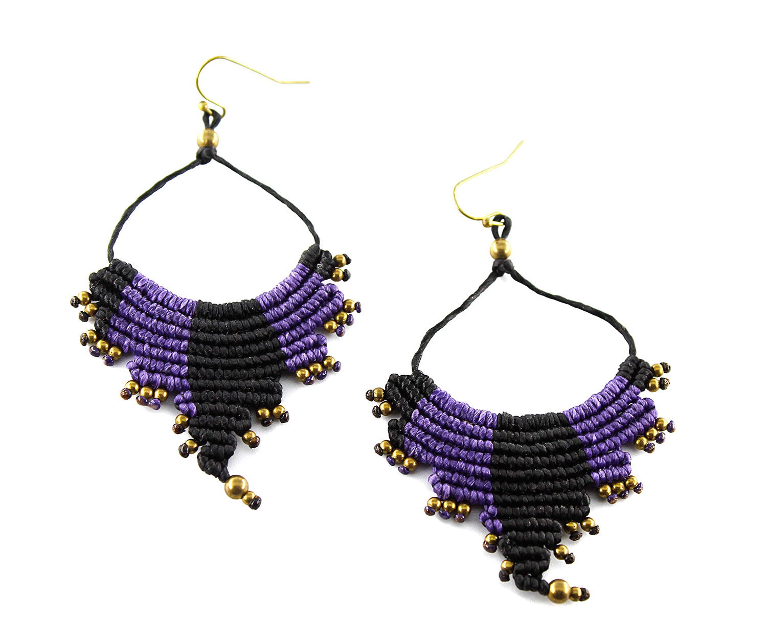 Beautiful echo handmade earrings. Macrame is a technique that gives you the opportunity to create beautiful shapes and designs by knitting, using threads. These threads are 100% hypoallergenic and extremely durable. The colours are never fade out over the years due to the quality of the thread. You can find them in two options : with black and purple wax thread or brown and blue. Decorated with brass beads.