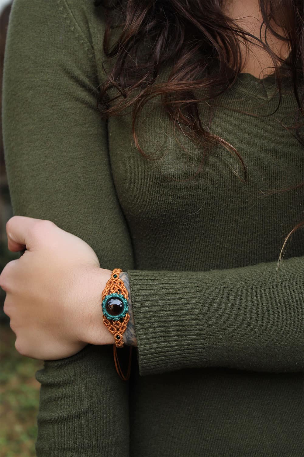 Beautiful Halla handmade bracelet. Macrame is a technique that gives you the opportunity to create beautiful shapes and designs by knitting, using threads. These threads are 100% hypoallergenic and extremely durable. The colours are never fade out over the years due to the quality of the thread. For halla bracelet we used green and camel colours of thread. Decorated with genuine crystal clear smoky quartz semi precious stone. A translucent variety of quartz for balancing and grounding.