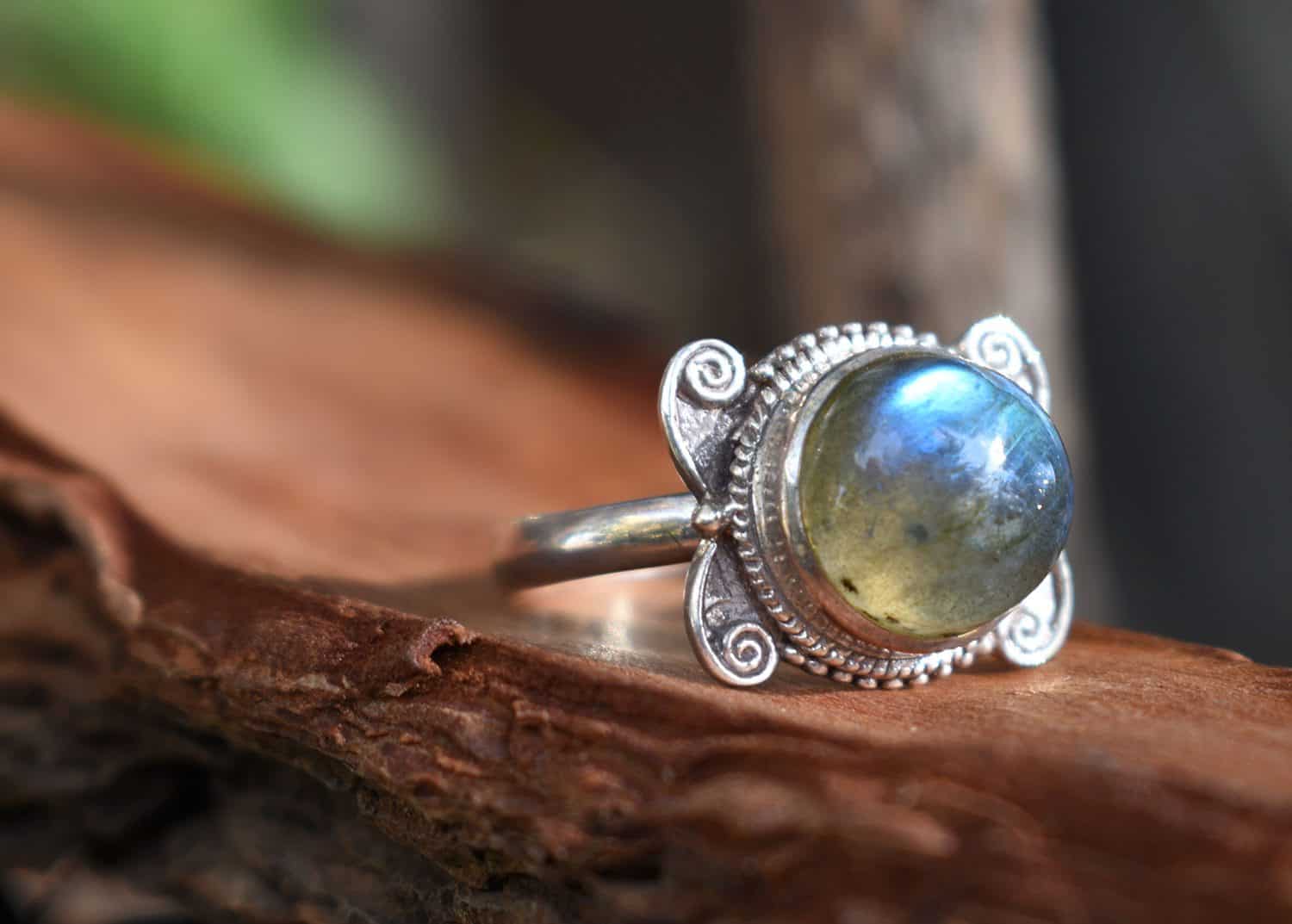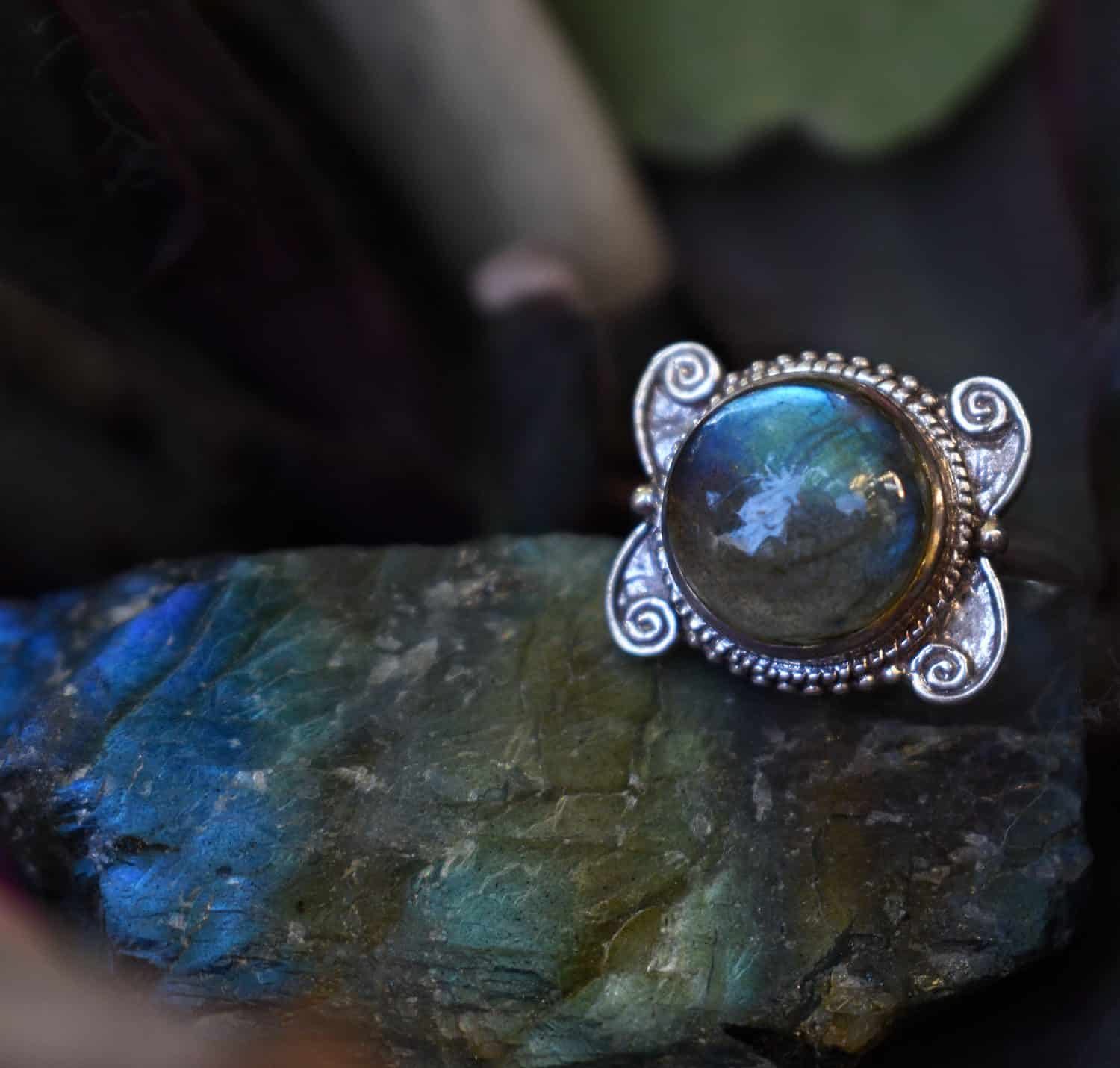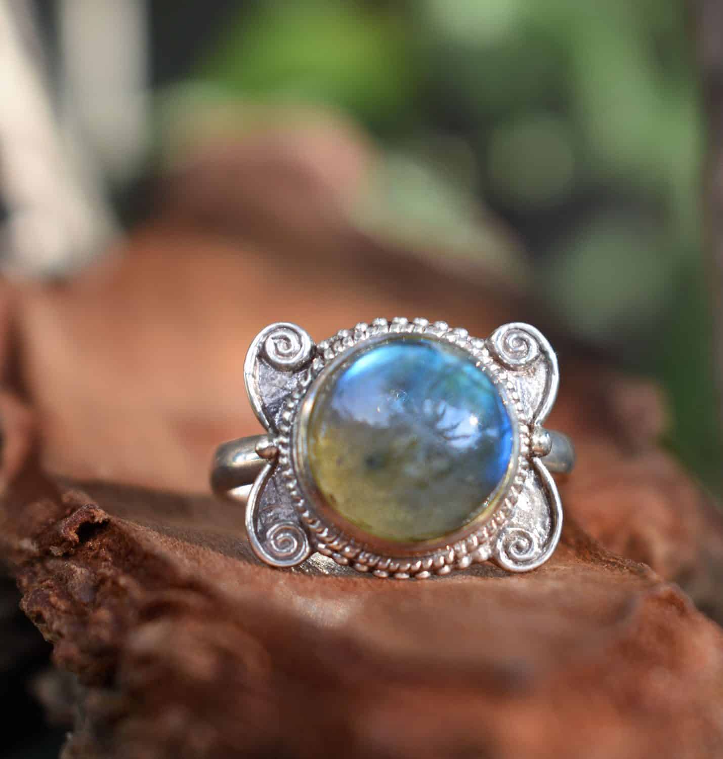 Stunning carved sterling silver 925 ring decorated with genuine labradorite semi precious stone.