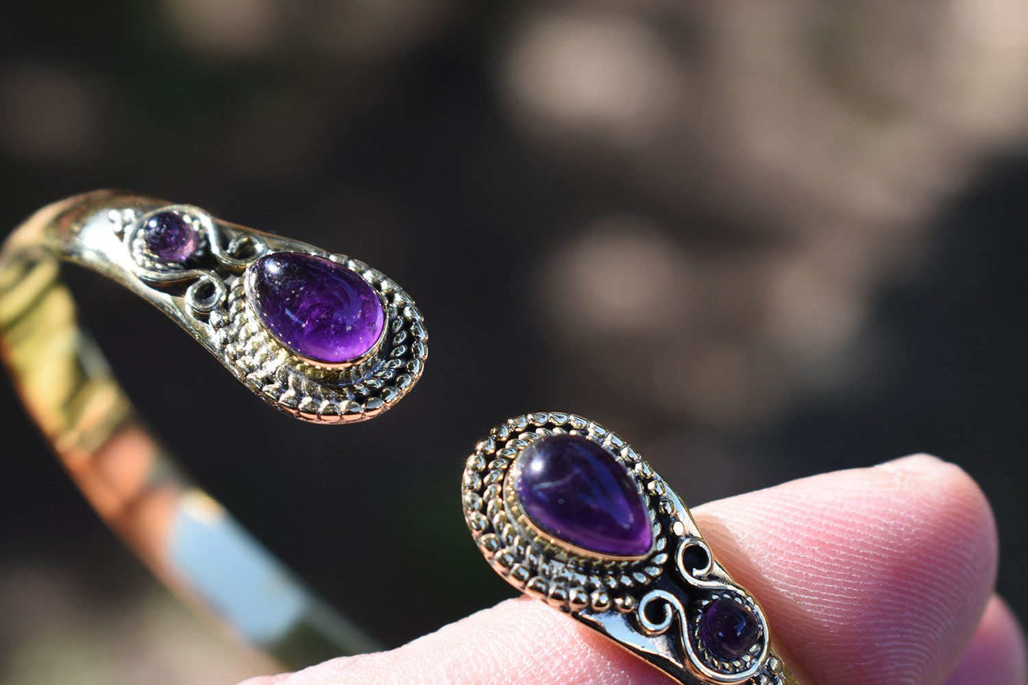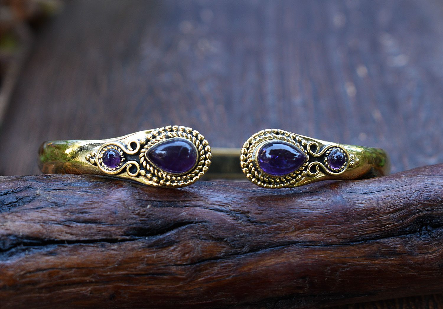 Beautiful imlaris brass cuff bracelet decorated with genuine moonstone or amethyst semi precious stone. Shaped and carved in such a detailed way that makes imlaris bracelet amazing. Very easy to clean and maintain when you need.