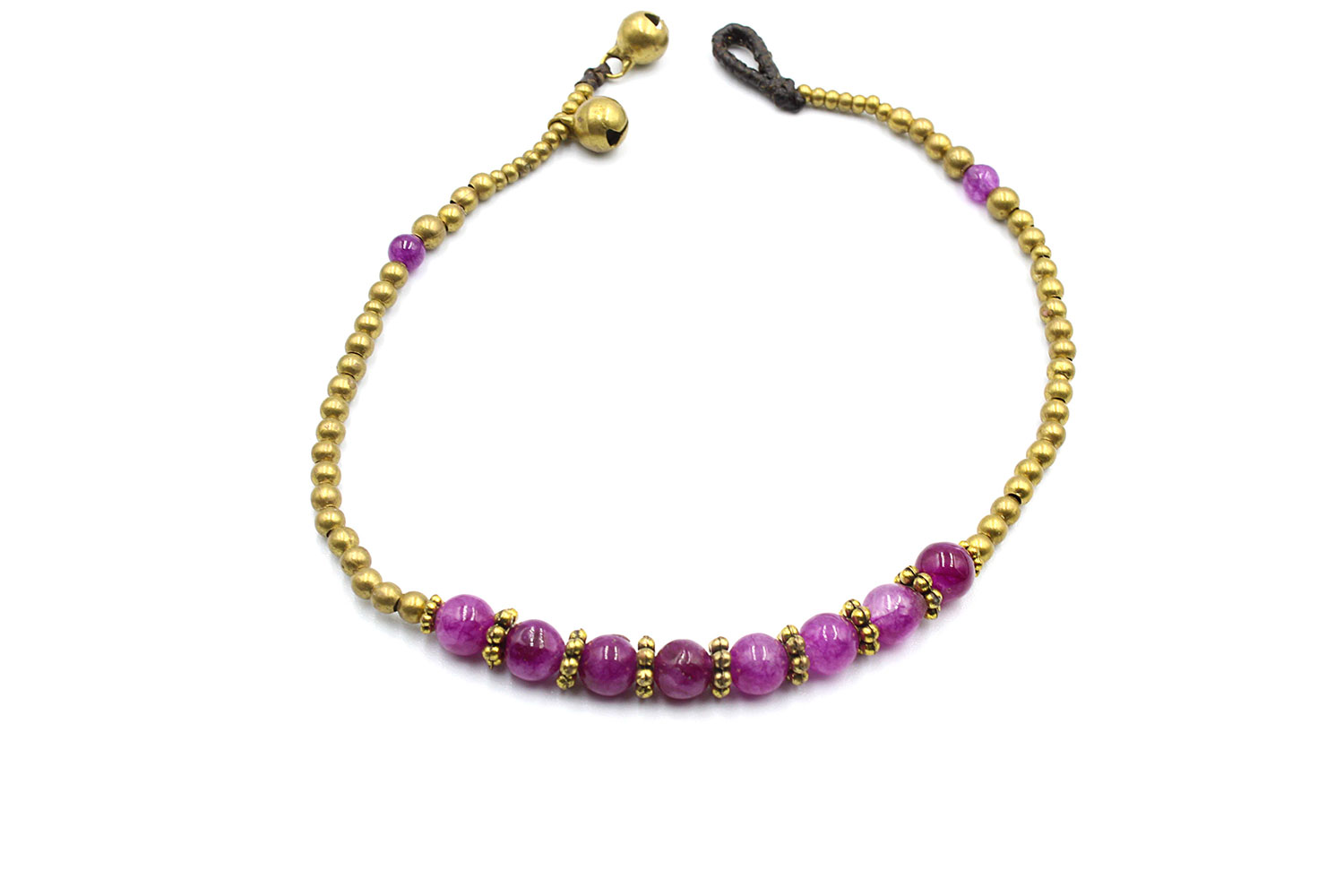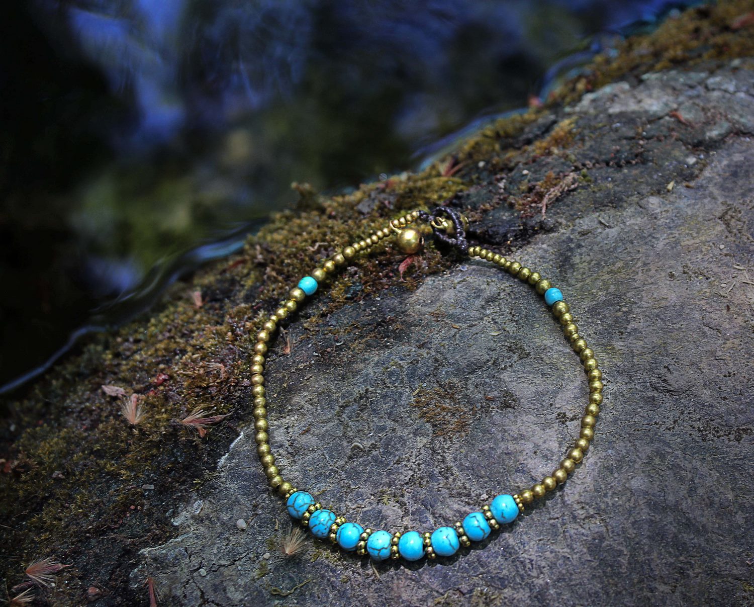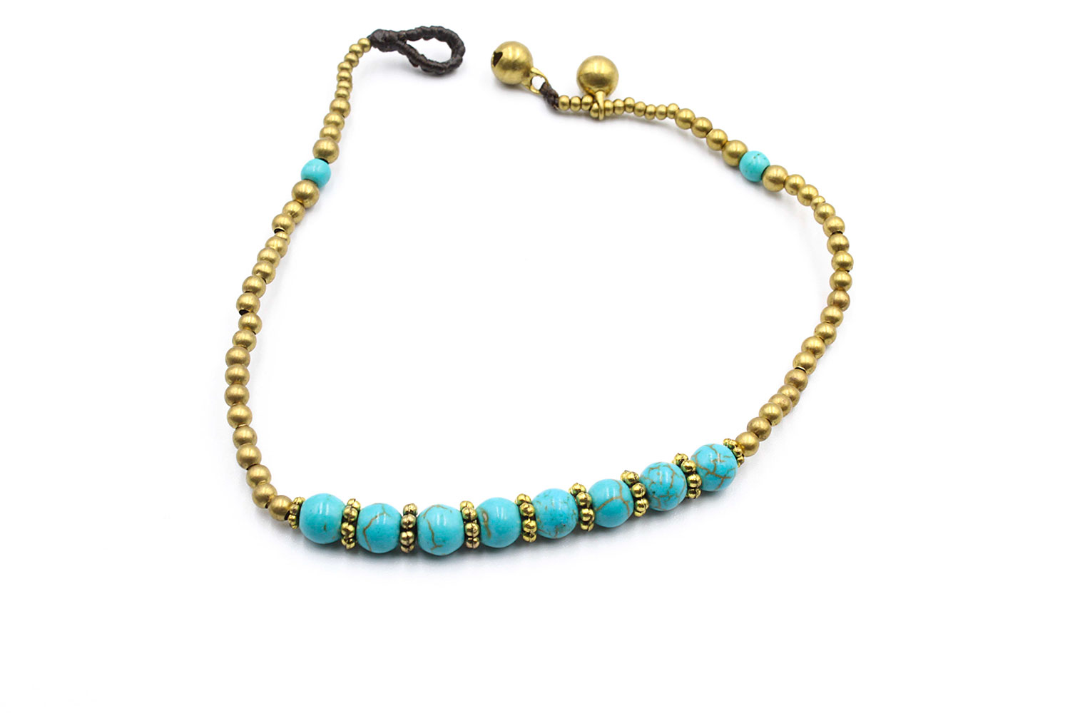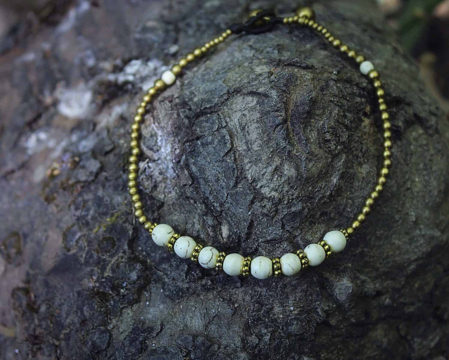 Elegant anklets using best quality waxed thread, brass beads and two jingle bells as clasp. Adjustable in one of two jingle bells. You can find them in three different options : with turquoise, howlite or agate beads.