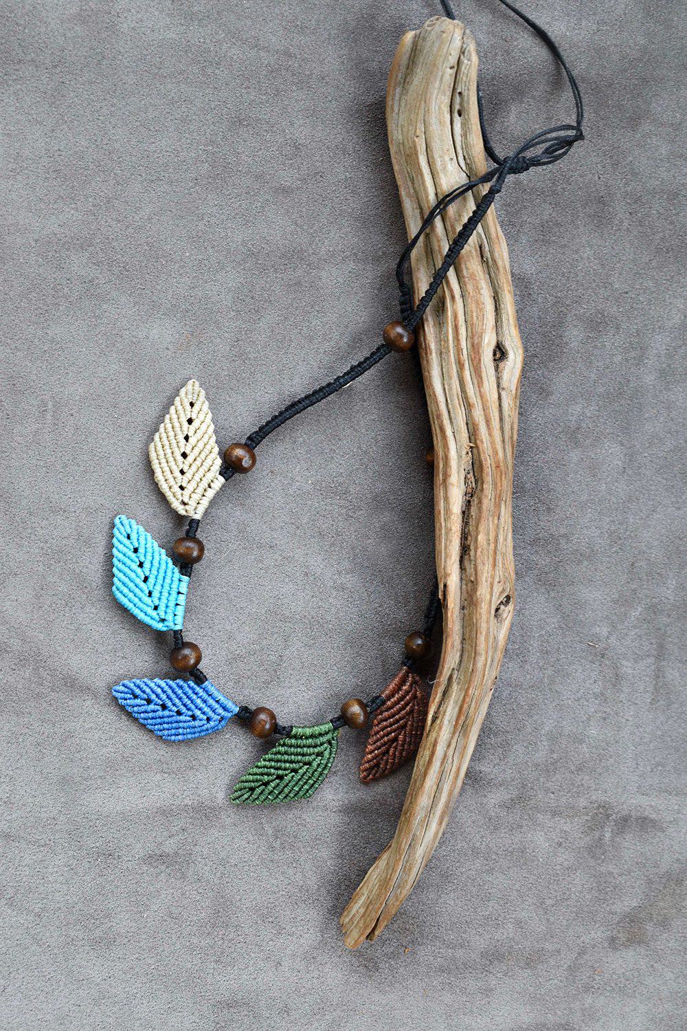 Beautiful leafs of forest necklace. Macrame is a technique that gives you the opportunity to create beautiful shapes and designs by knitting, using threads. These threads are 100% hypoallergenic and extremely durable. The colours are never fade out over the years due to the quality of the thread. Decorated with wood beads.