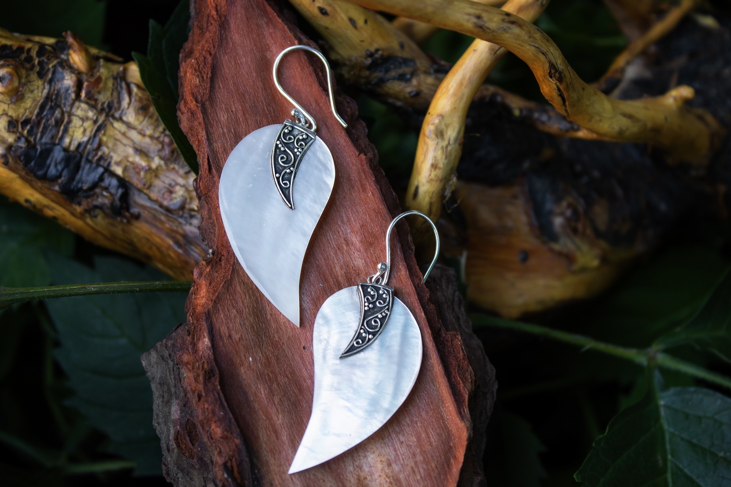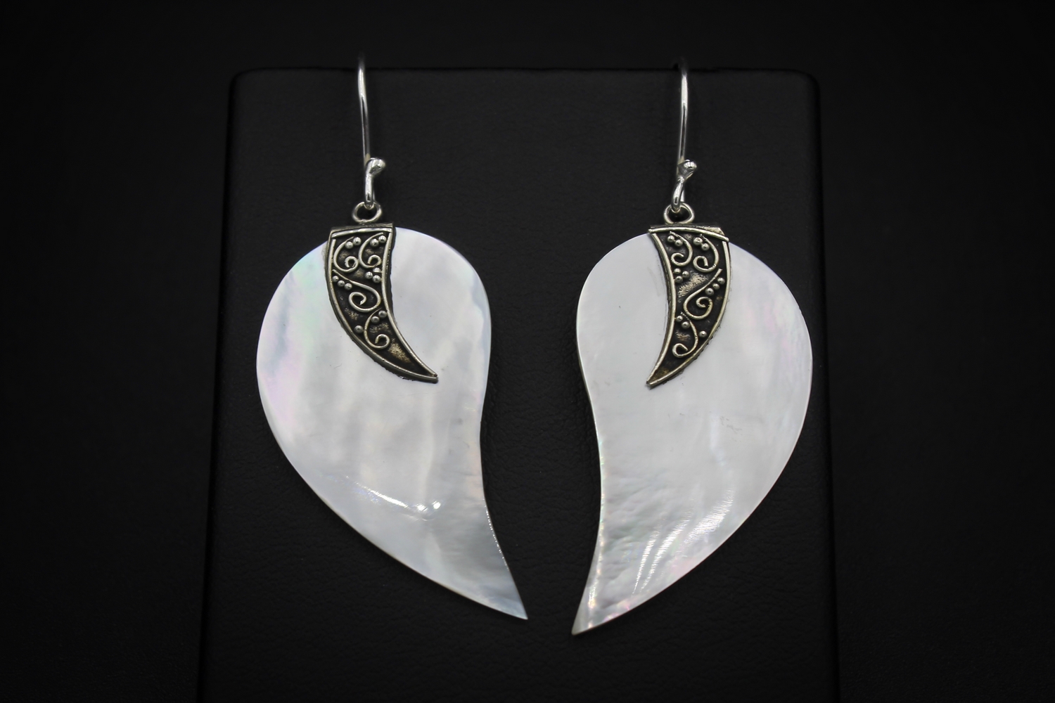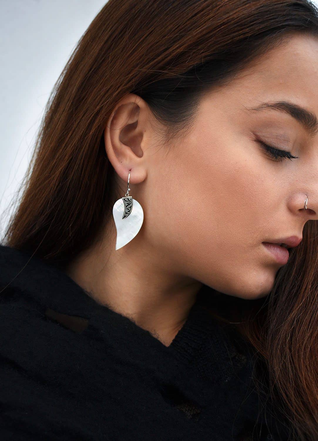 Mother of pearl is one of the most stunning miracles of mother nature. The lucent iridescent white colour of the shells reflect the pristine natural environment in which they are formed. Shaped and carved in such a detailed way that makes Maia sterling silver 925 earrings amazing.