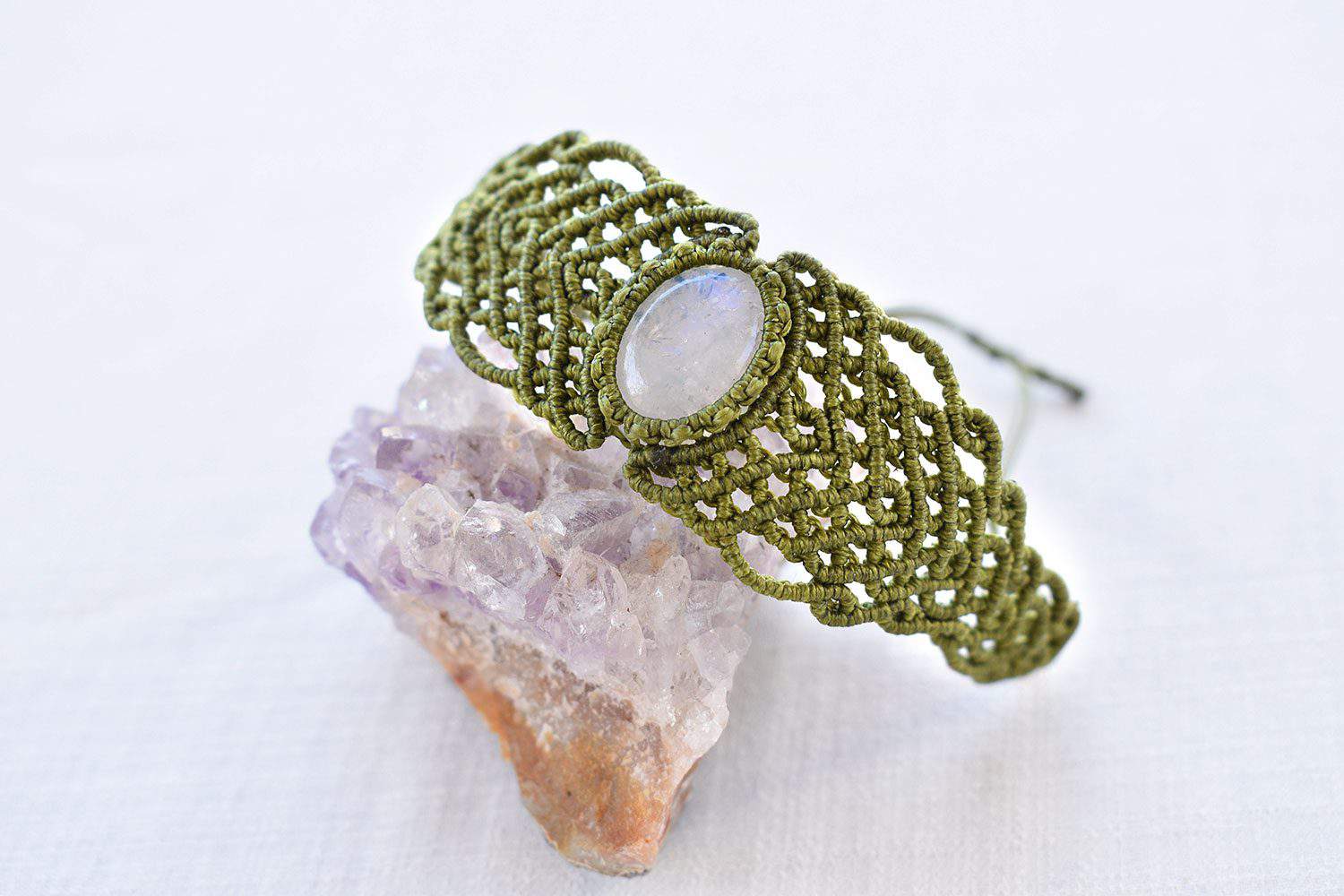 Beautiful moonstone handmade bracelet. Macrame is a technique that gives you the opportunity to create beautiful shapes and designs by knitting, using threads. These threads are 100% hypoallergenic and extremely durable. The colours are never fade out over the years due to the quality of the thread. For moonstone bracelet we used green colour. Decorated with genuine crystal clear moonstone semi precious stone. Concidered to be the stone of inner growth and strength. Enhances love and hope while promotes inspiration.