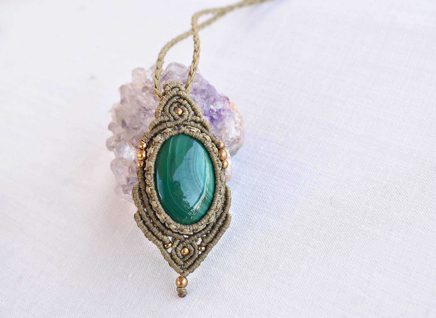 Beautiful navi handmade necklace. Macrame is a technique that gives you the opportunity to create beautiful shapes and designs by knitting, using threads. These threads are 100% hypoallergenic and extremely durable. The colours are never fade out over the years due to the quality of the thread. For navi necklace we used green colour. Decorated with genuine crystal clear malachite semi precious stone. Malachite is known as a protection stone, absorbing the negative energies around and from within you. Very helpful for positive outlook of life and balance of the mood.