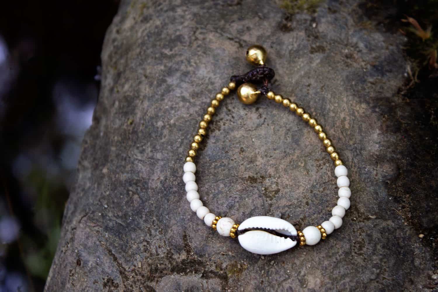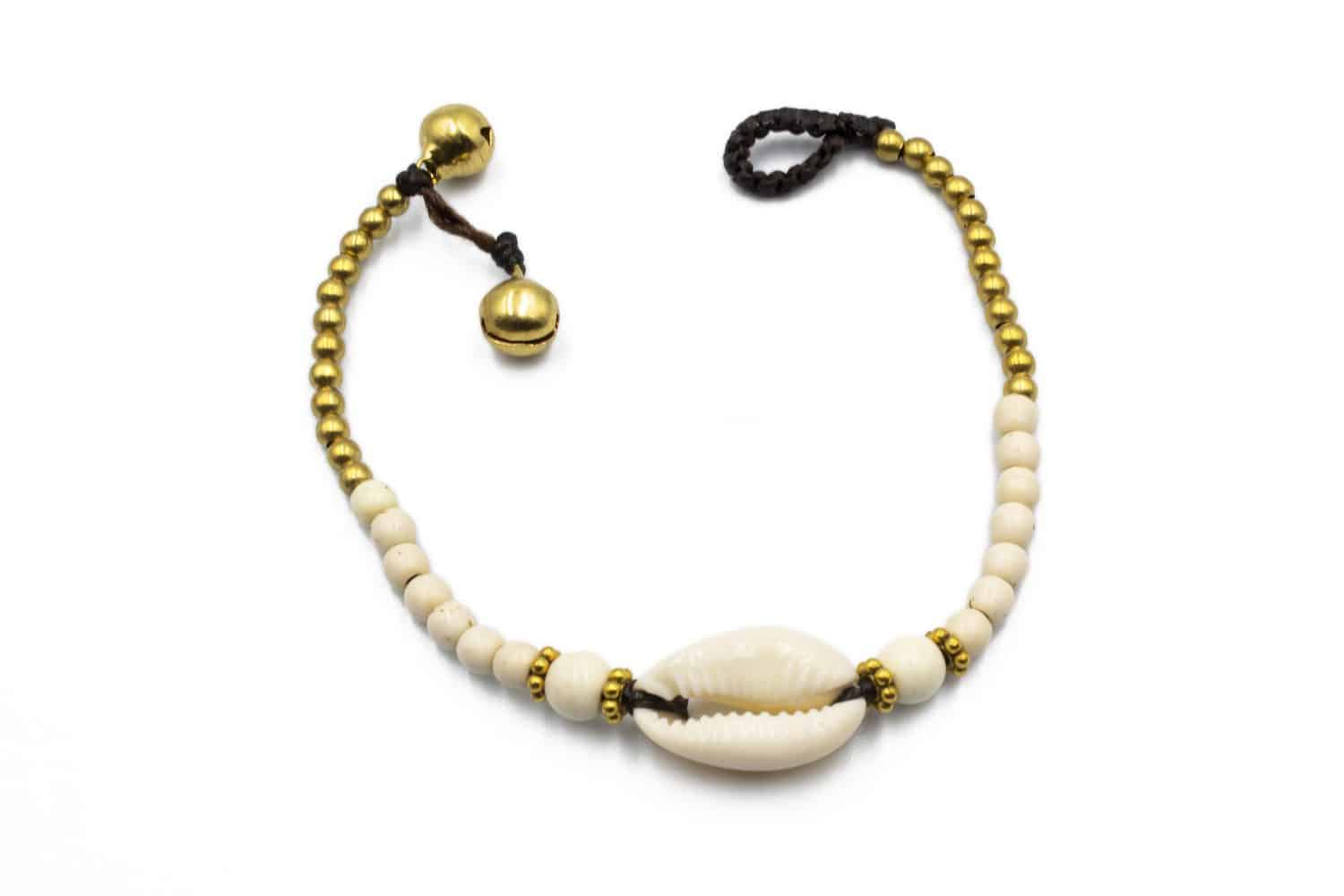 Elegant bracelet using best quality waxed thread, brass beads, howlite beads, natural sea shell and two jingle bells as clasp. Adjustable in one of two jingle bells.