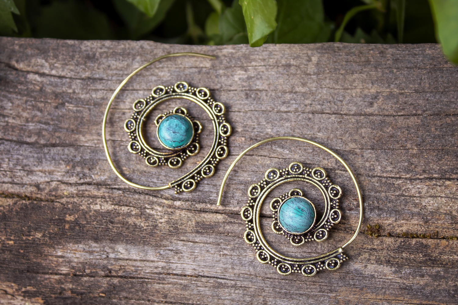 Beautiful omega brass earrings with unique design. Decorated with turquoise howlite stone. Shaped and carved in such a perfect and detailed way that makes omega earrings amazing.