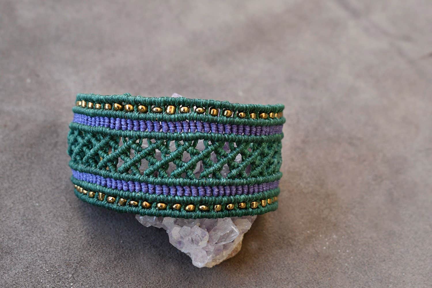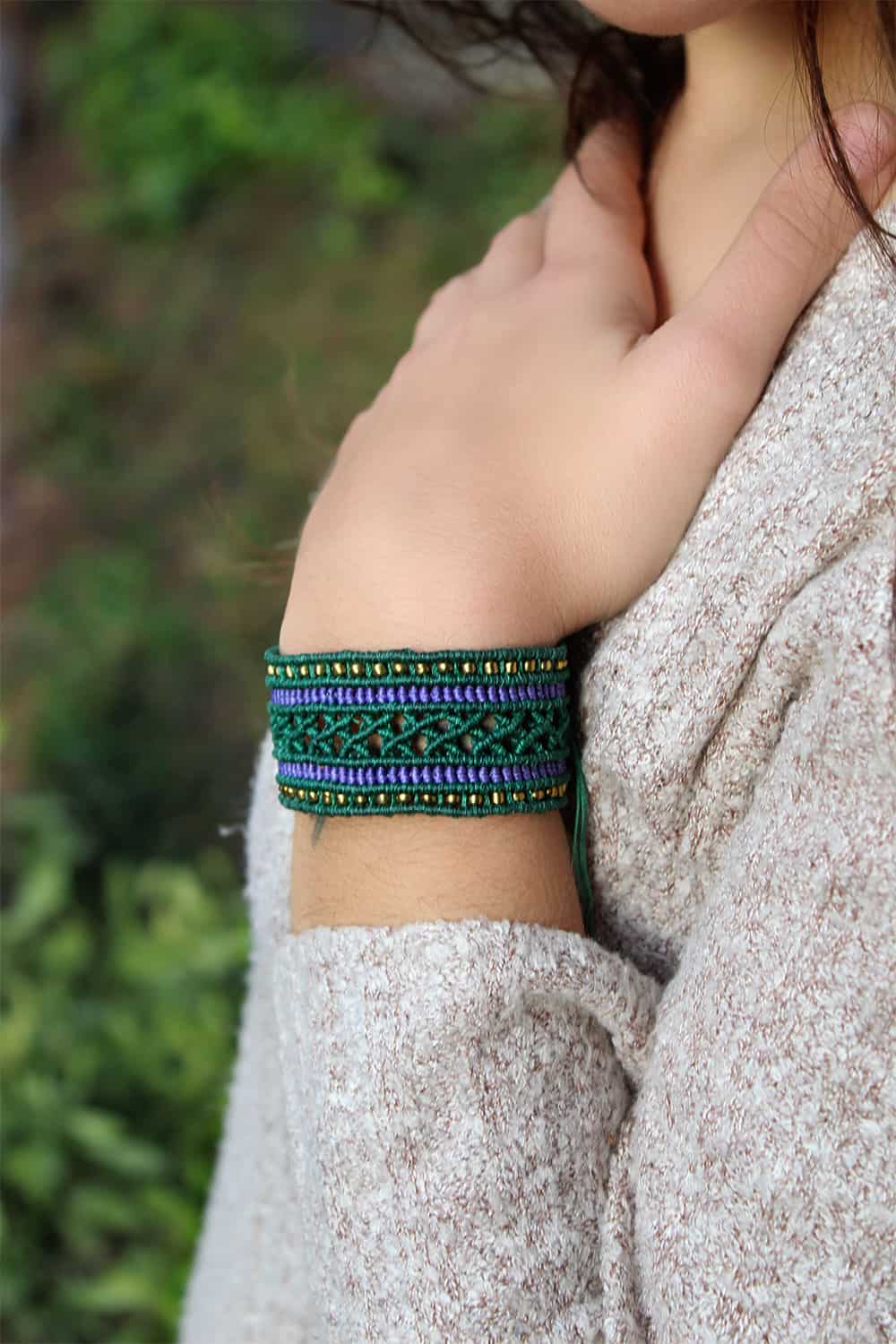 Beautiful Pythia handmade bracelet. Macrame is a technique that gives you the opportunity to create beautiful shapes and designs by knitting, using threads. These threads are 100% hypoallergenic and extremely durable. The colours are never fade out over the years due to the quality of the thread. For pythia bracelet we used purple and green colours of threads.