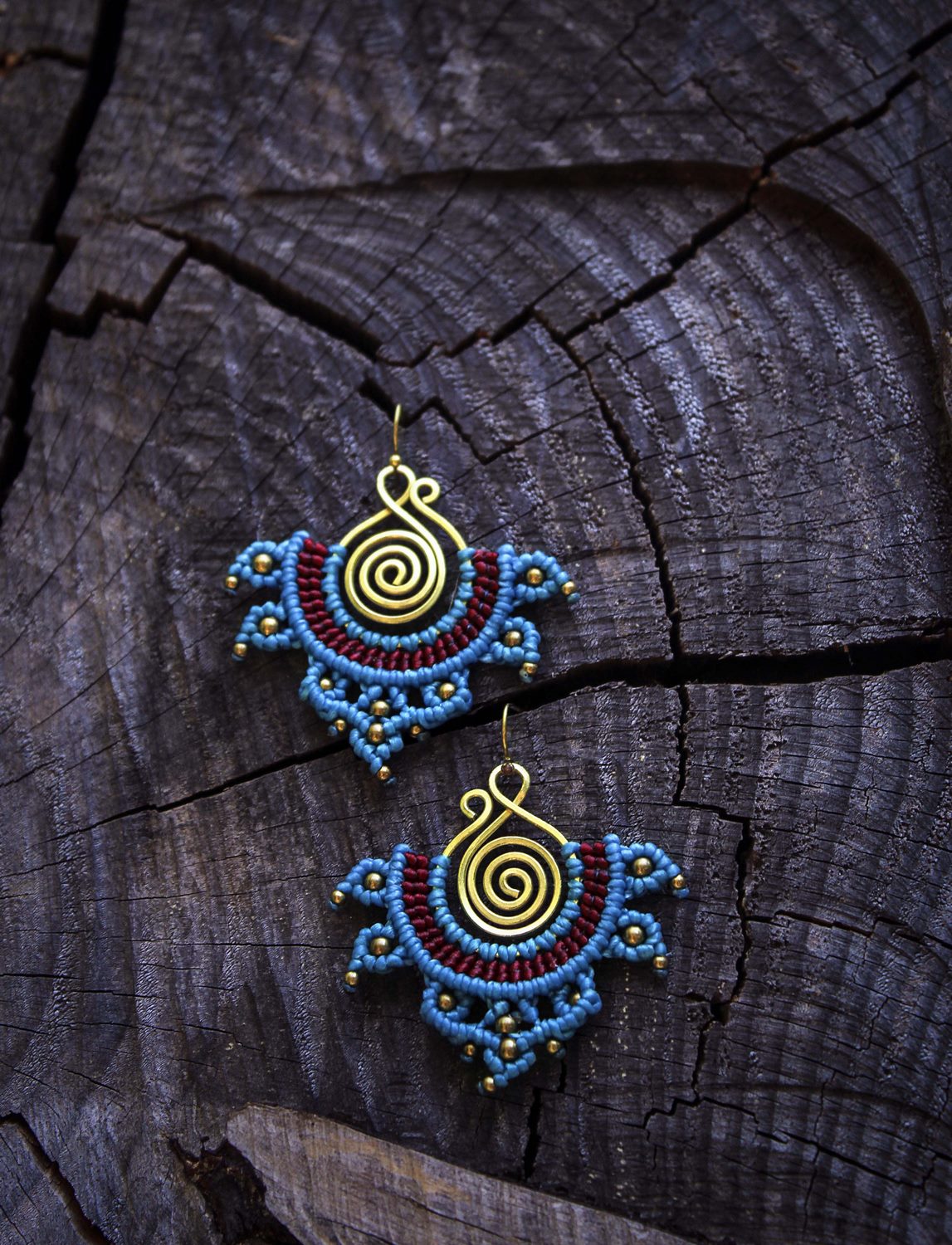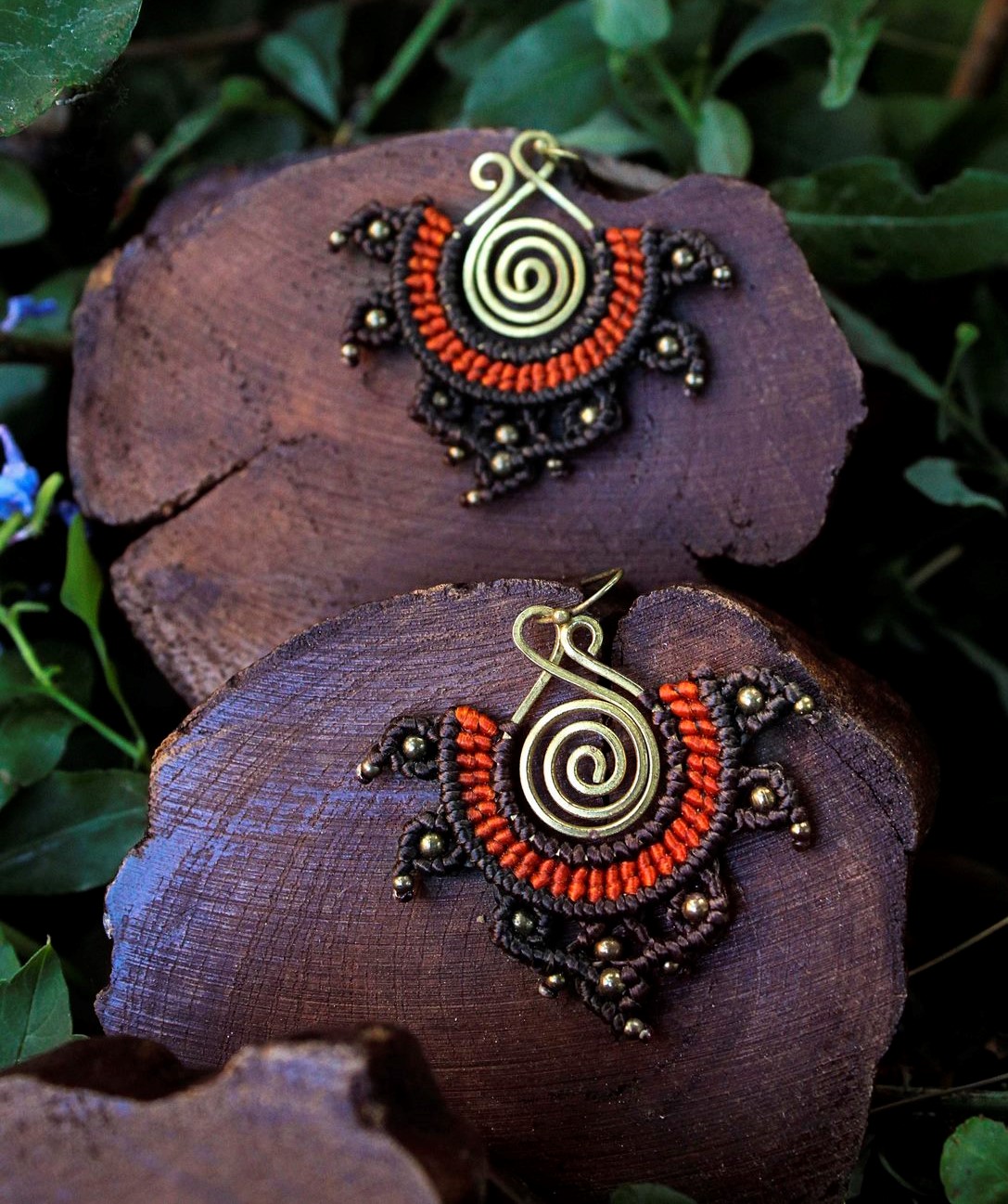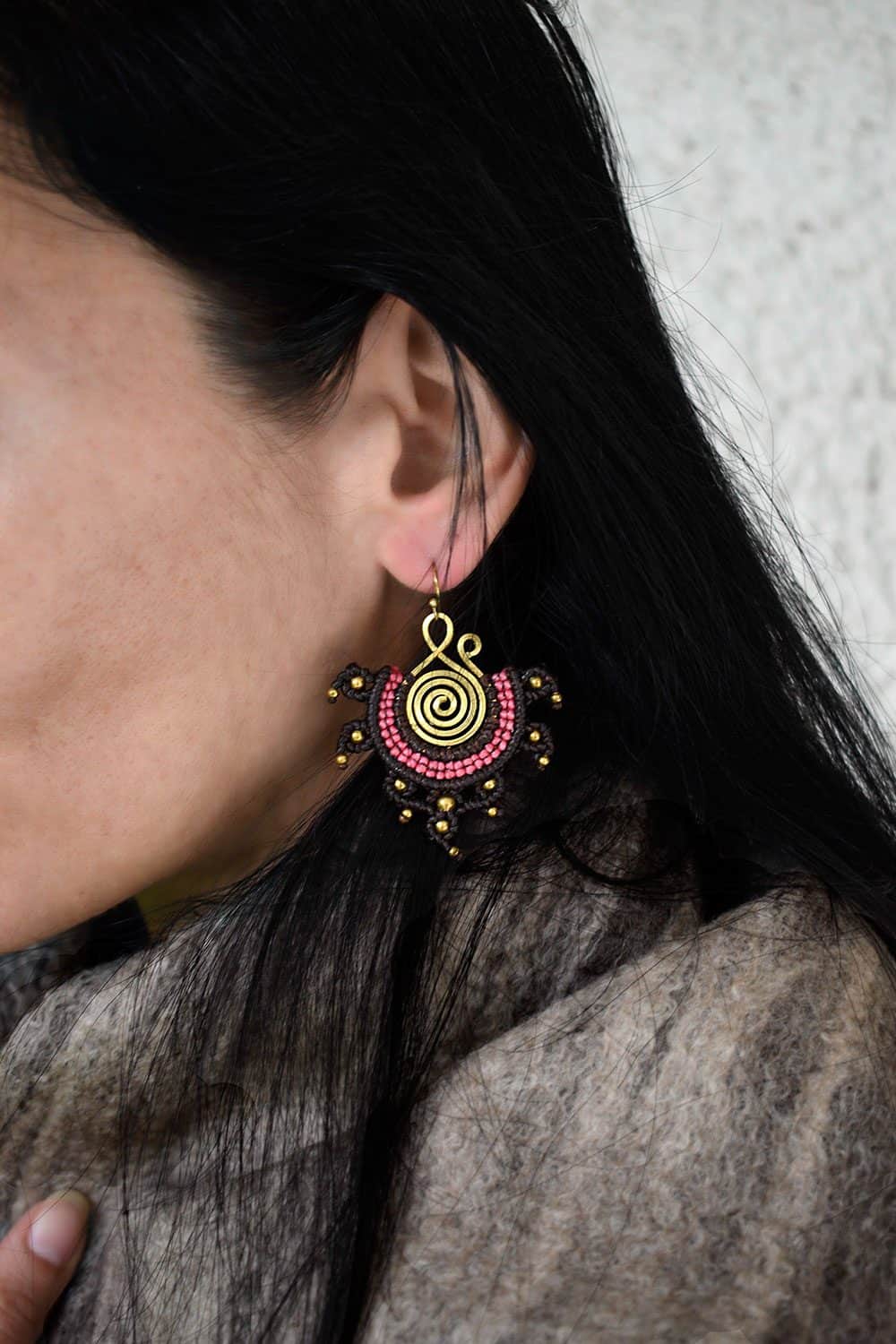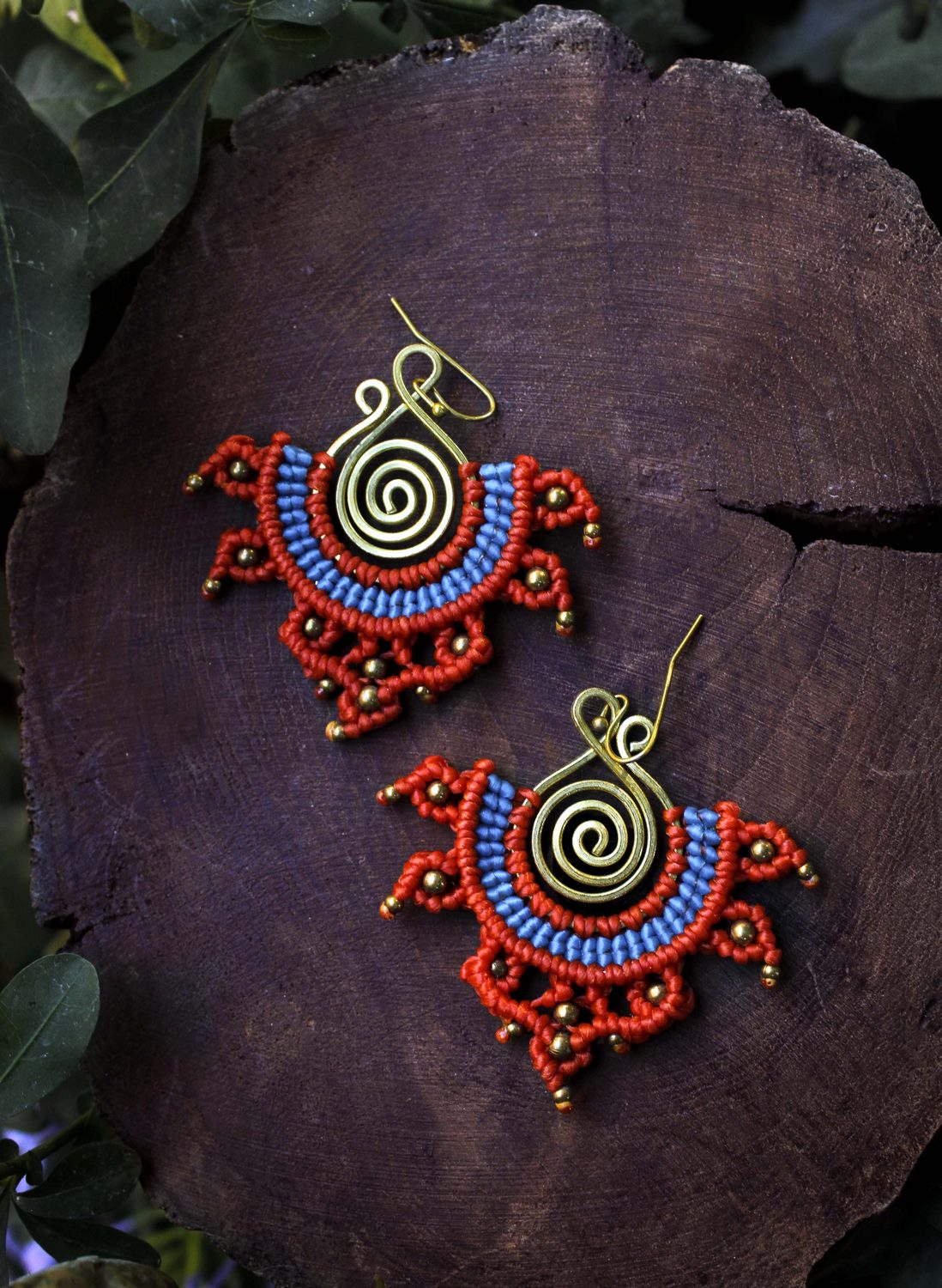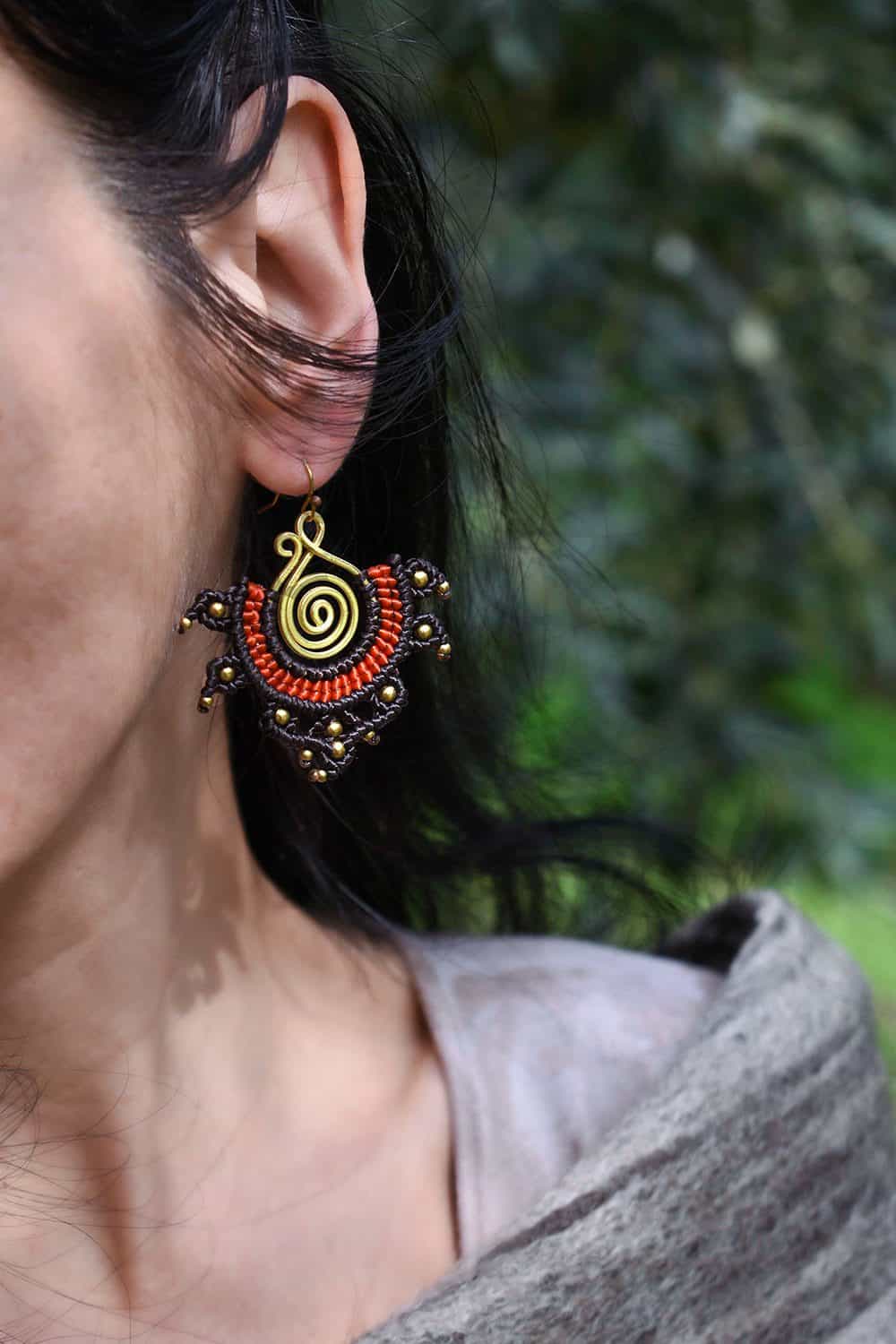 Beautiful rana handmade earrings. Macrame is a technique that gives you the opportunity to create beautiful shapes and designs by knitting, using threads. These threads are 100% hypoallergenic and extremely durable. The colours are never fade out over the years due to the quality of the thread. You can find them in six different options : 1)dark brown and orange, 2) dark brown and lilac, 3) blue and red, 4) green and black, 5) green and red and 6) light red and blue. Decorated with brass beads and a brass spiral element.