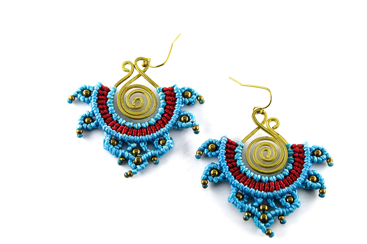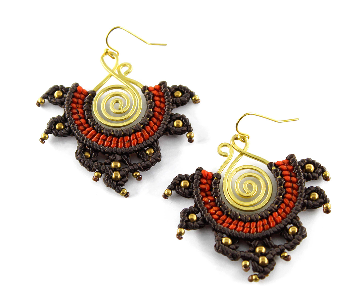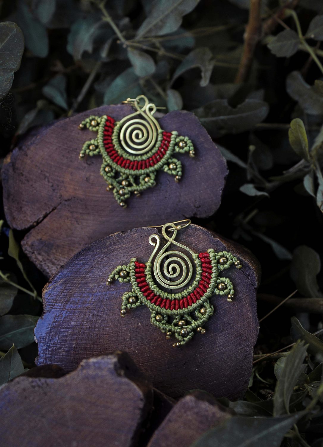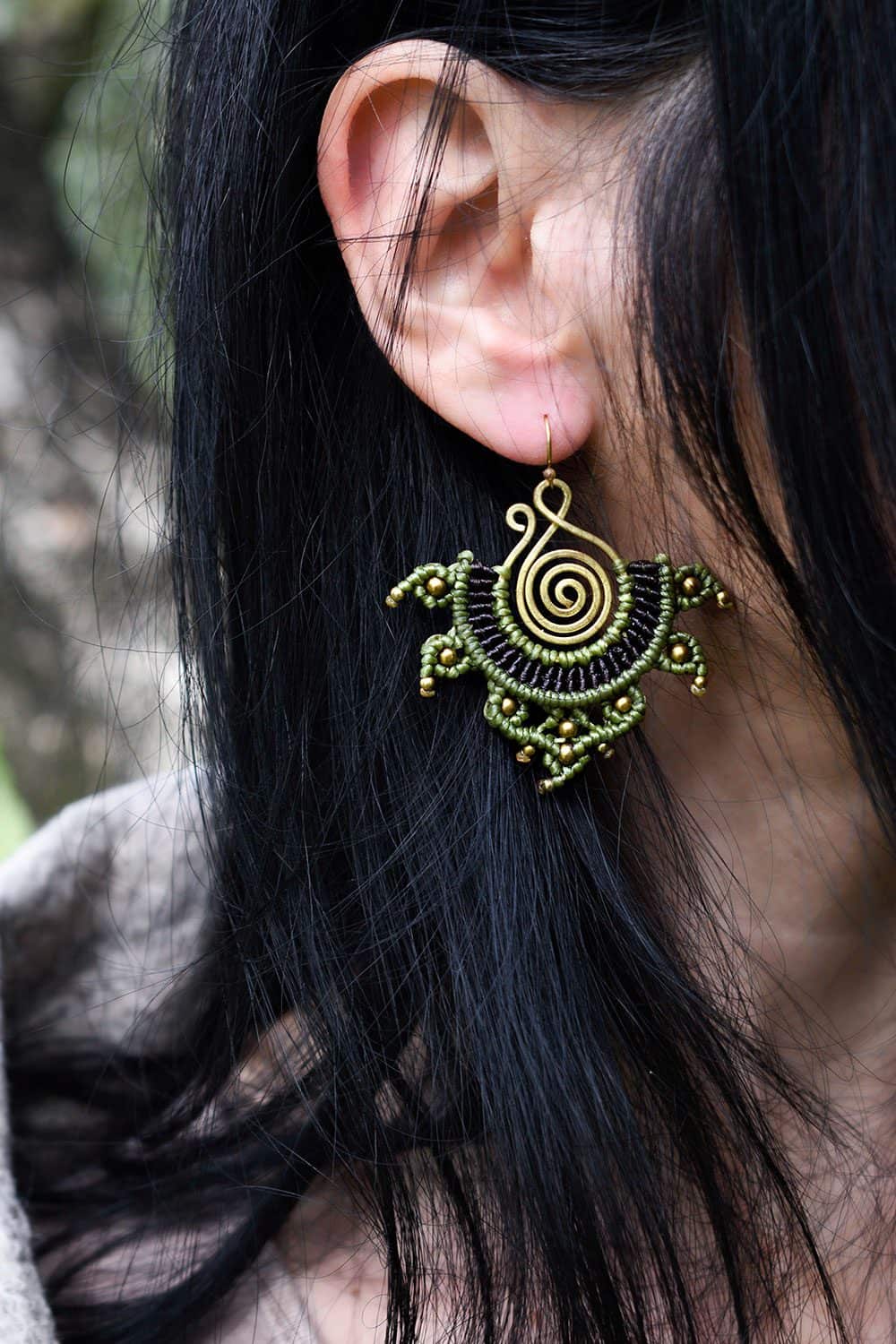 Beautiful rana handmade earrings. Macrame is a technique that gives you the opportunity to create beautiful shapes and designs by knitting, using threads. These threads are 100% hypoallergenic and extremely durable. The colours are never fade out over the years due to the quality of the thread. You can find them in six different options : 1)dark brown and orange, 2) dark brown and lilac, 3) blue and red, 4) green and black, 5) green and red and 6) light red and blue. Decorated with brass beads and a brass spiral element.