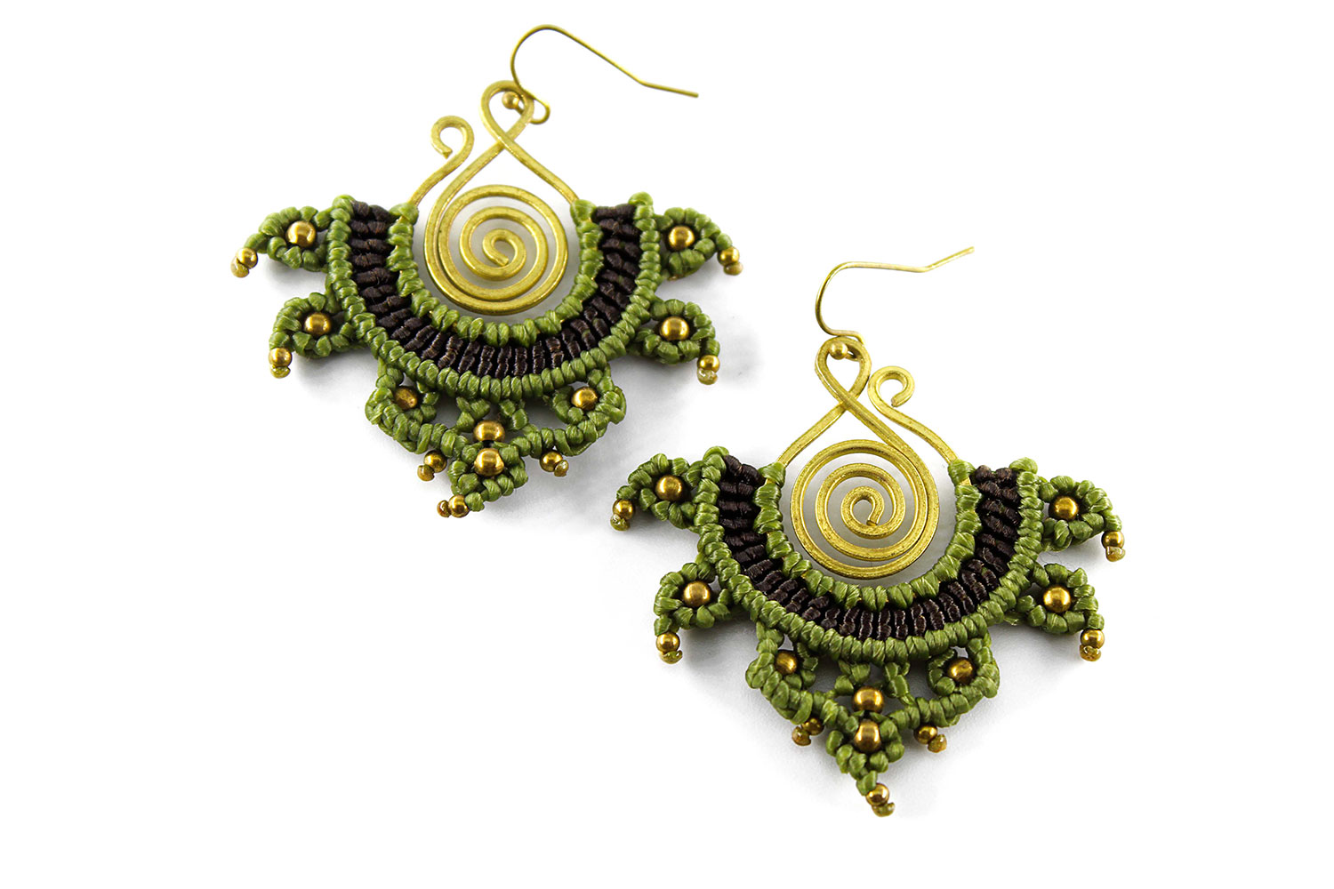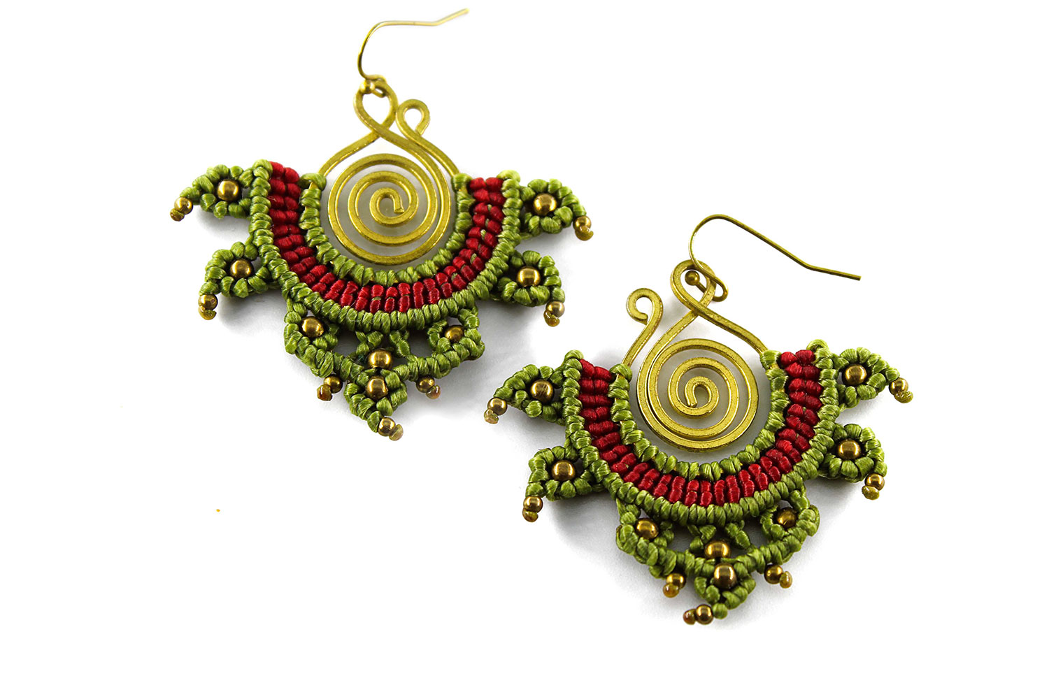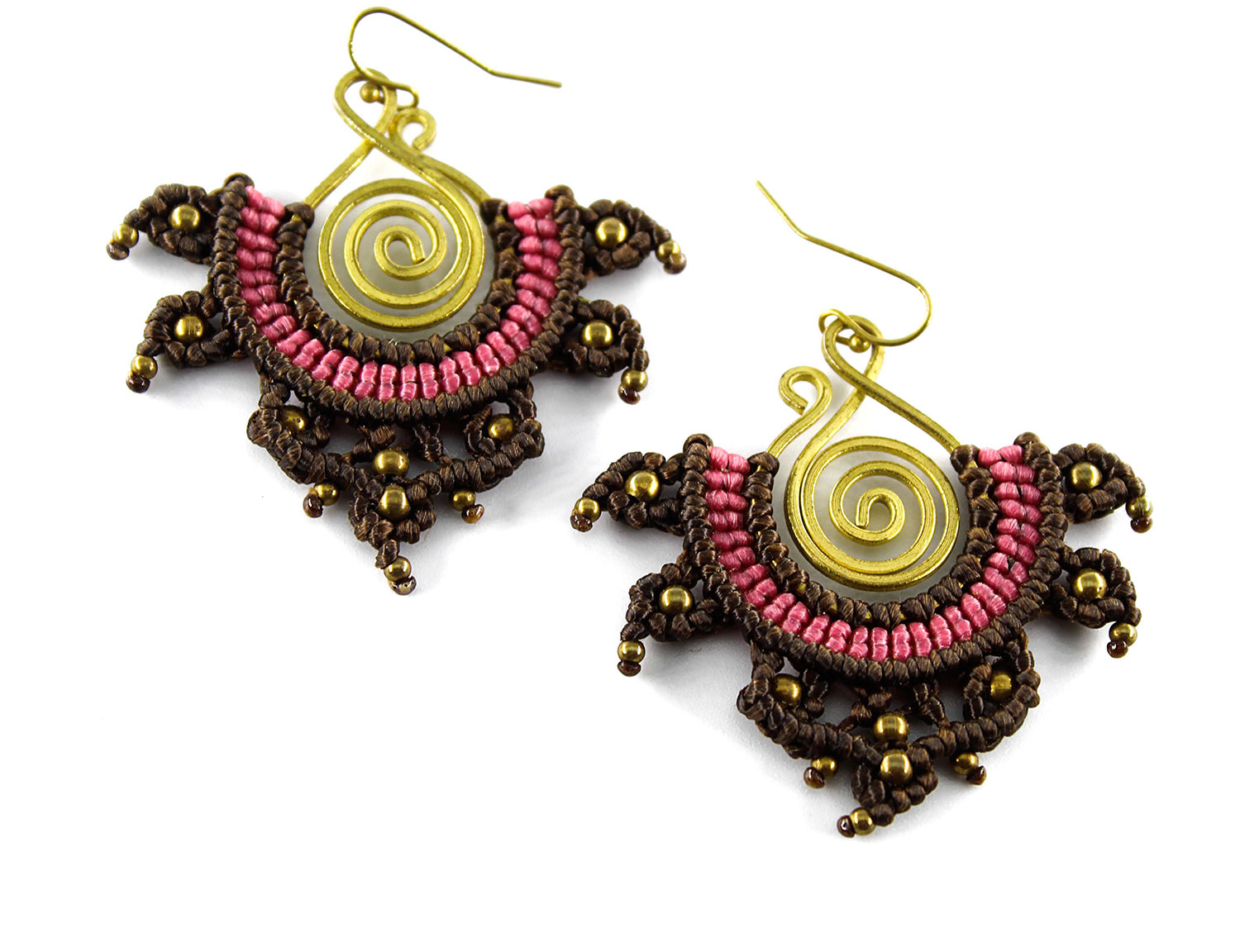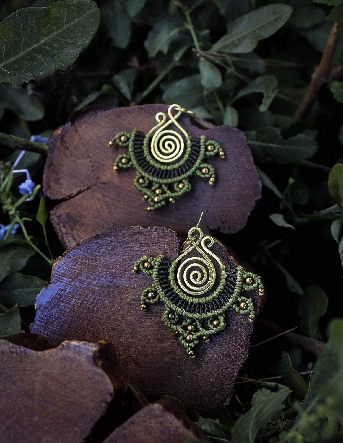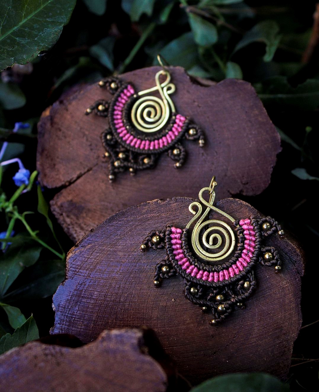 Beautiful rana handmade earrings. Macrame is a technique that gives you the opportunity to create beautiful shapes and designs by knitting, using threads. These threads are 100% hypoallergenic and extremely durable. The colours are never fade out over the years due to the quality of the thread. You can find them in six different options : 1)dark brown and orange, 2) dark brown and lilac, 3) blue and red, 4) green and black, 5) green and red and 6) light red and blue. Decorated with brass beads and a brass spiral element.