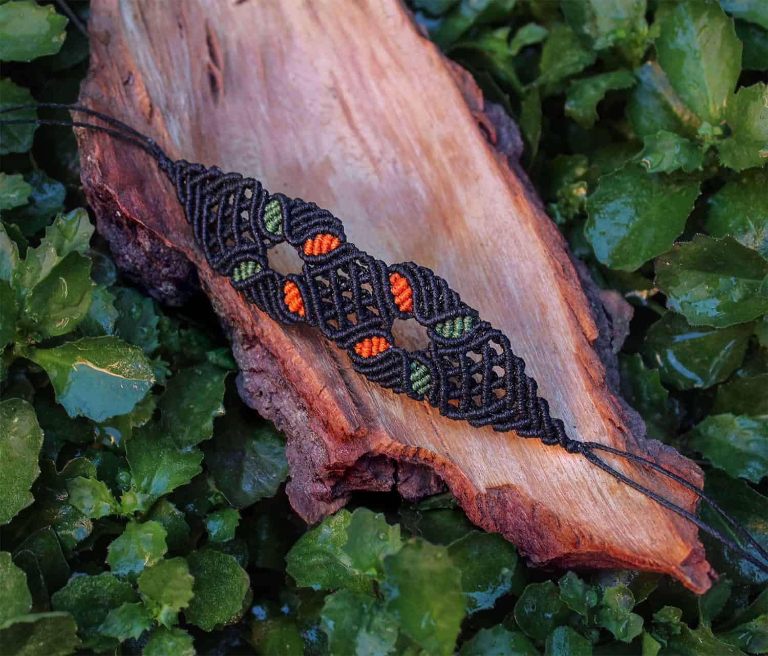 Beautiful rhea handmade bracelet. Macrame is a technique that gives you the opportunity to create beautiful shapes and designs by knitting, using threads. These threads are 100% hypoallergenic and extremely durable. The colours are never fade out over the years due to the quality of the thread. For rhea bracelet we used black,orange and green colours of thread.