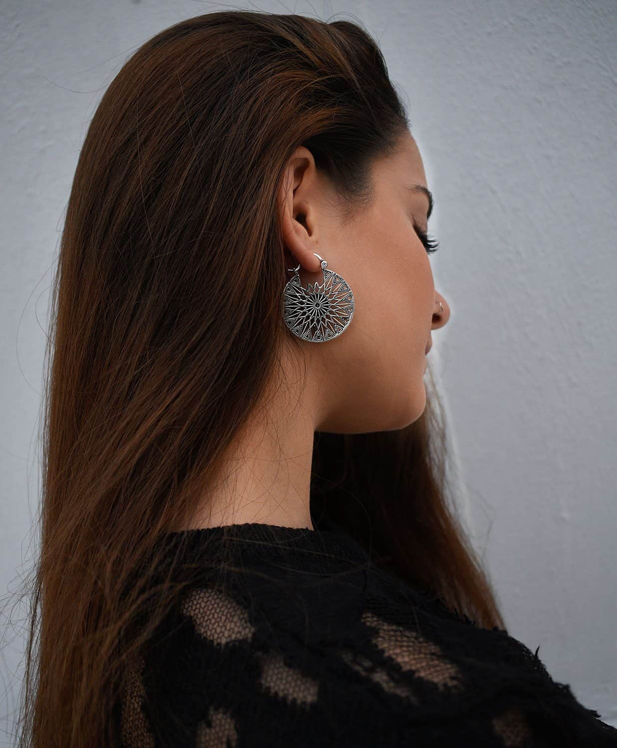 Beautiful sacred wheel silver plated earrings with a unique shape. Very easy to clean and maintain when you need.