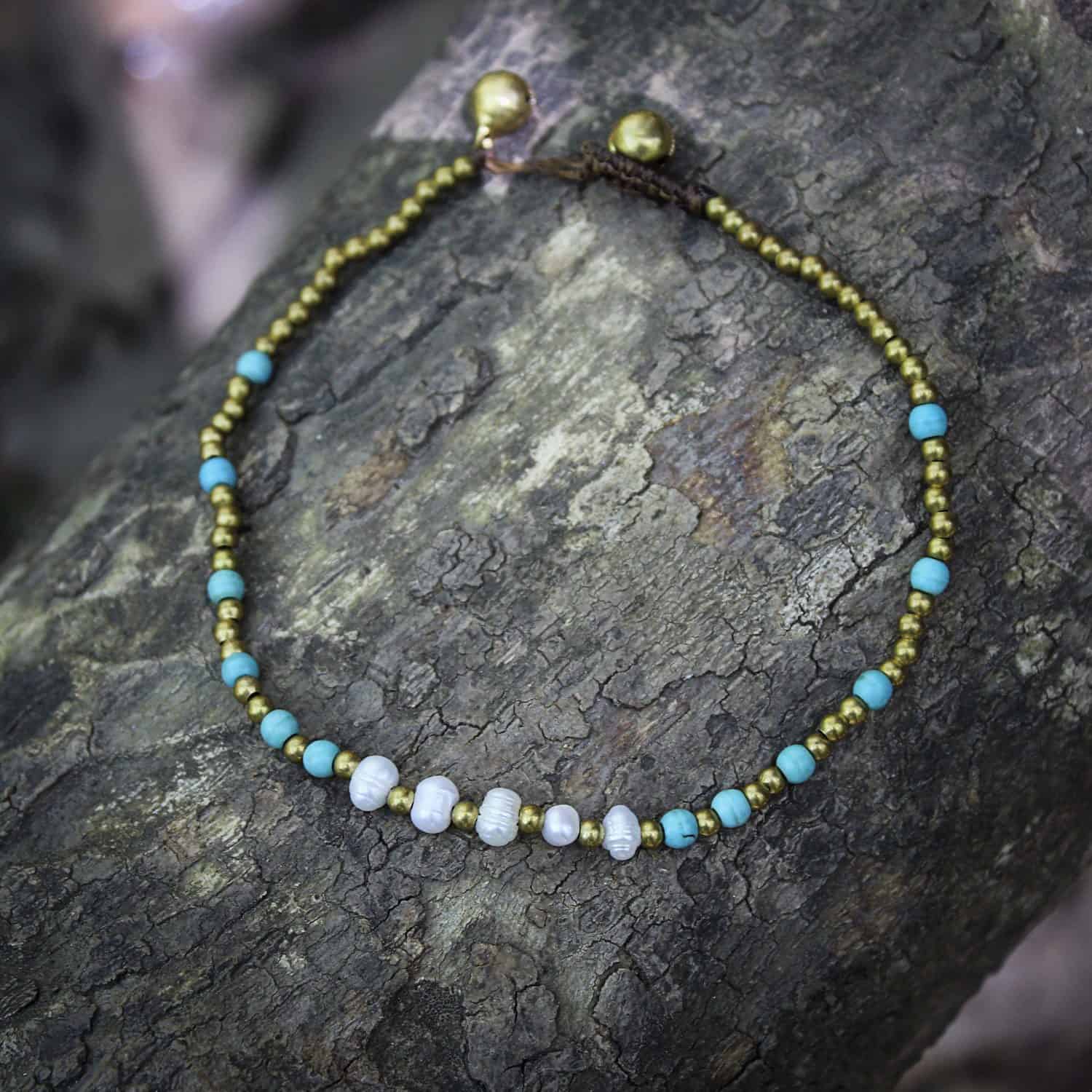Elegant anklet using best quality waxed thread, brass and howlite beads, natural mother of pearl beads and two jingle bells as clasp. Adjustable in one of two jingle bells.